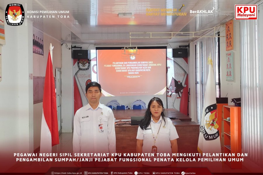 #TemanPemilih, PNS Sekretariat KPU Kabupaten Toba Mengikuti Pelantikan dan Pengambilan Sumpah/Janji Pejabat Fungsional Penata Kelola Pemilihan Umum, Balige. Kamis (22/1/2026). Sekretariat Jenderal Komisi Pemilihan Umum Republik Indonesia senantiasa berkomitmen meningkatkan kualitas pelayanan publik dan profesionalisme lembaga. 2 orang PNS Sekretaris KPU Kabupaten Toba mengikuti Pelantikan dan Pengambilan Sumpah/Janji secara daring di Lingkungan Sekretariat Jenderal KPU, Sekretariat KPU Provinsi/KIP Aceh dan Sekretariat KPU/KIP Kabupaten/Kota pada hari Kamis, 22 Januari 2026. Pelantikan dan Pengambilan Sumpah/Janji di Lingkungan Sekretariat Jenderal KPU RI ini dipimpin langsung oleh Sekretaris Jenderal KPU RI, Bernad Dermawan Sutrisno. Hadir secara langsung di Ruang RPP KPU Kabupaten Toba, Sekretaris KPU Kabupaten Toba bersama jajaran Kepala Sub Bagian, serta staf pegawai ASN Sekretariat KPU Kabupaten Toba untuk memberikan dukungan penuh kepada rekan-rekan yang dilantik. Pelantikan dan Pengambilan Sumpah/Janji ini bertujuan untuk Optimalisasi Kinerja,Tata Kelola Pemilu/Pemilihan yang Akuntabel, serta Penguatan Kelembagaan. Selesai prosesi pelantikan, Sekretaris Jenderal KPU RI, Bernad Dermawan Sutrisno, dan Ketua KPU RI, Mohammad Afifuddin, memberikan arahan penting. Dalam arahannya, Bernad menegaskan bahwa jabatan fungsional Penata Kelola Pemilu merupakan tanggung jawab penuh yang memiliki peran penting dan khas dalam kelembagaan KPU serta harus dijalankan secara profesional di seluruh satuan kerja. Sementara itu, Afifuddin menyampaikan harapannya agar pelantikan ini menjadi awal yang baik bagi perjalanan karier para pegawai. Afif juga menyampaikan ucapan selamat serta menegaskan dukungan penuh pimpinan KPU RI terhadap seluruh aktivitas yang menunjang pelaksanaan tugas kepemiluan. Selesai acara, kegiatanpun ditutup dengan pemberian ucapan selamat kepada PNS yang dilantik dalam Jabatan Fungsional Penata Kelola Pemilihan Umum dimaksud, atas nama Yohanna Indah L. Sitorus, dan Michael Fransisko Nainggolan, serta sesi foto bersama. #KPUMelayani ....