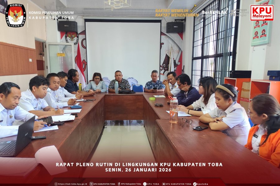 #TemanPemilih, Rapat Pleno Rutin Perdana KPU Kabupaten Toba Tahun 2026, Balige. Senin, (26/1/2026). KPU Kabupaten Toba melaksanakan rapat pleno rutin yang dipimpin oleh Ketua KPU Kabupaten Toba Sugar Fernando Sibarani, serta dihadiri oleh para anggota KPU Kabupaten Toba, pada hari Senin, Tanggal 26 Januari 2026. Dalam rapat pleno ini, membahas terkait rencana pelaksanaan kegiatan di Tahun 2026, termasuk didalamnya pelaksanaan pendidikan pemilih berkelanjutan melalui media sosial resmi KPU Kabupaten Toba, dan kegiatan lainnya sesuai dengan tugas, pokok, dan fungsi. Segenap jajaran Sekretariat KPU Kabupaten Toba, Sekretaris, Para Kepala Subbagian, dan seluruh Staf ASN menghadiri Rapat Pleno Rutin di ruang RPP KPU Kabupaten Toba. #KPUMelayani ....