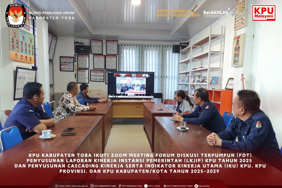 #TemanPemilih, KPU Kabupaten Toba Ikuti Zoom Meeting Forum Diskusi Terpumpun (FDT) Penyusunan Laporan Kinerja Instansi Pemerintah (LKjIP) KPU Tahun 2025 dan Penyusunan Cascading Kinerja Serta Indikator Kinerja Utama (IKU) KPU, KPU Provinsi, dan KPU Kabupaten/Kota Tahun 2025-2029. Balige, Selasa (27/1/2026). KPU Kabupaten Toba mengikuti kegiatan Forum Diskusi Terpumpun (FDT) Penyusunan Laporan Kinerja Instansi Pemerintah (LKjIP) KPU Tahun 2025 dan Penyusunan Cascading Kinerja Serta Indikator Kinerja Utama (IKU) KPU, KPU Provinsi, dan KPU Kabupaten/Kota Tahun 2025-2029, kegiatan ini diikuti oleh Ketua KPU Kabupaten Toba Sugar Fernando Sibarani, Sekretaris Richardo F. Butarbutar, Kasubbag SDM Frans L. Sitinjak, Kasubbag KUL Mardona Sinaga, Kasubbag Perdatin Haryanti Simarmata, dan Kasubbag Teknis Penyelenggaraan Mindo H. Simbolon, di ruang RPP Kantor KPU Kabupaten Toba. Tujuan FDT ini untuk menyelaraskan penyusunan LKjIP KPU Tahun 2025 dengan arah kebijakan nasional, serta menyamakan maupun memperkuat pemahaman dalam penyusunan cascading kinerja dan IKU KPU Provinsi, dan KPU Kabupaten/Kota untuk periode 2025-2029. Sehingga outputnya diharapkan seluruh satuan kerja KPU termasuk KPU Kabupaten Toba dalam menyusun dokumen kinerja lebih terukur, selaras, dan berorientasi pada hasil yang nantinya mampu mendukung terwujudnya tata kelola kelembagaan KPU sebagai Lembaga Penyelenggara Pemilu/Pemilihan yang profesional, transparan, dan akuntabel. #KPUMelayani ....