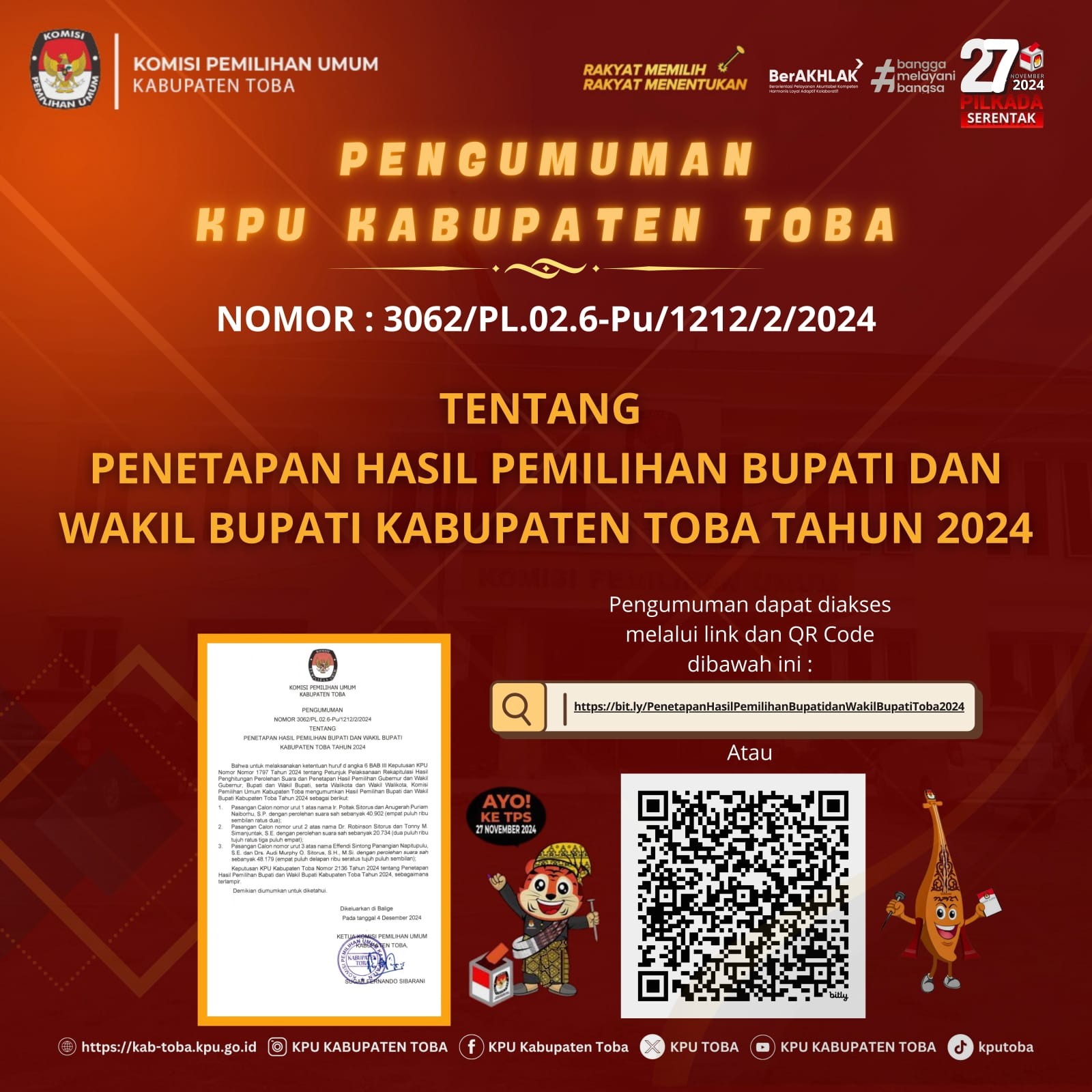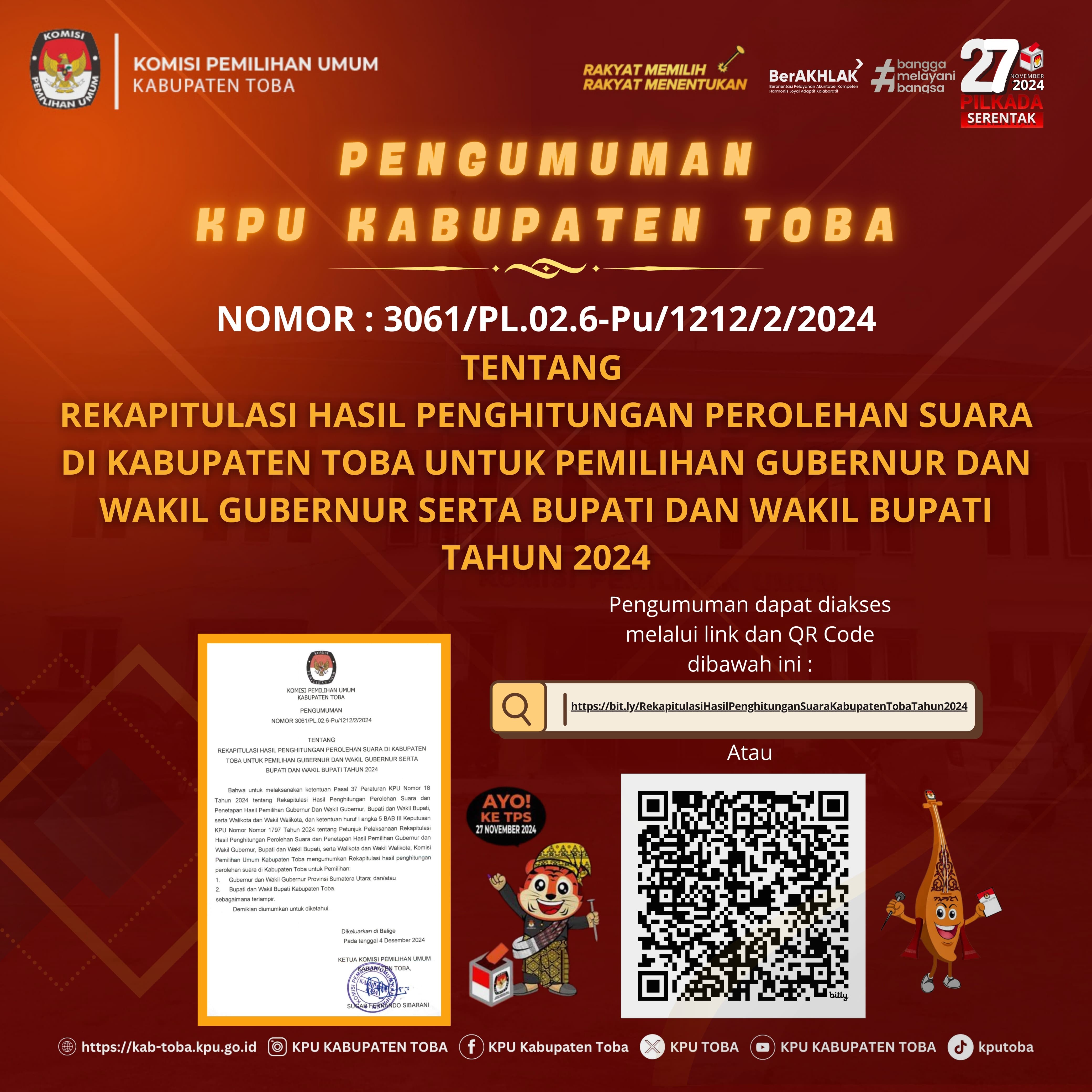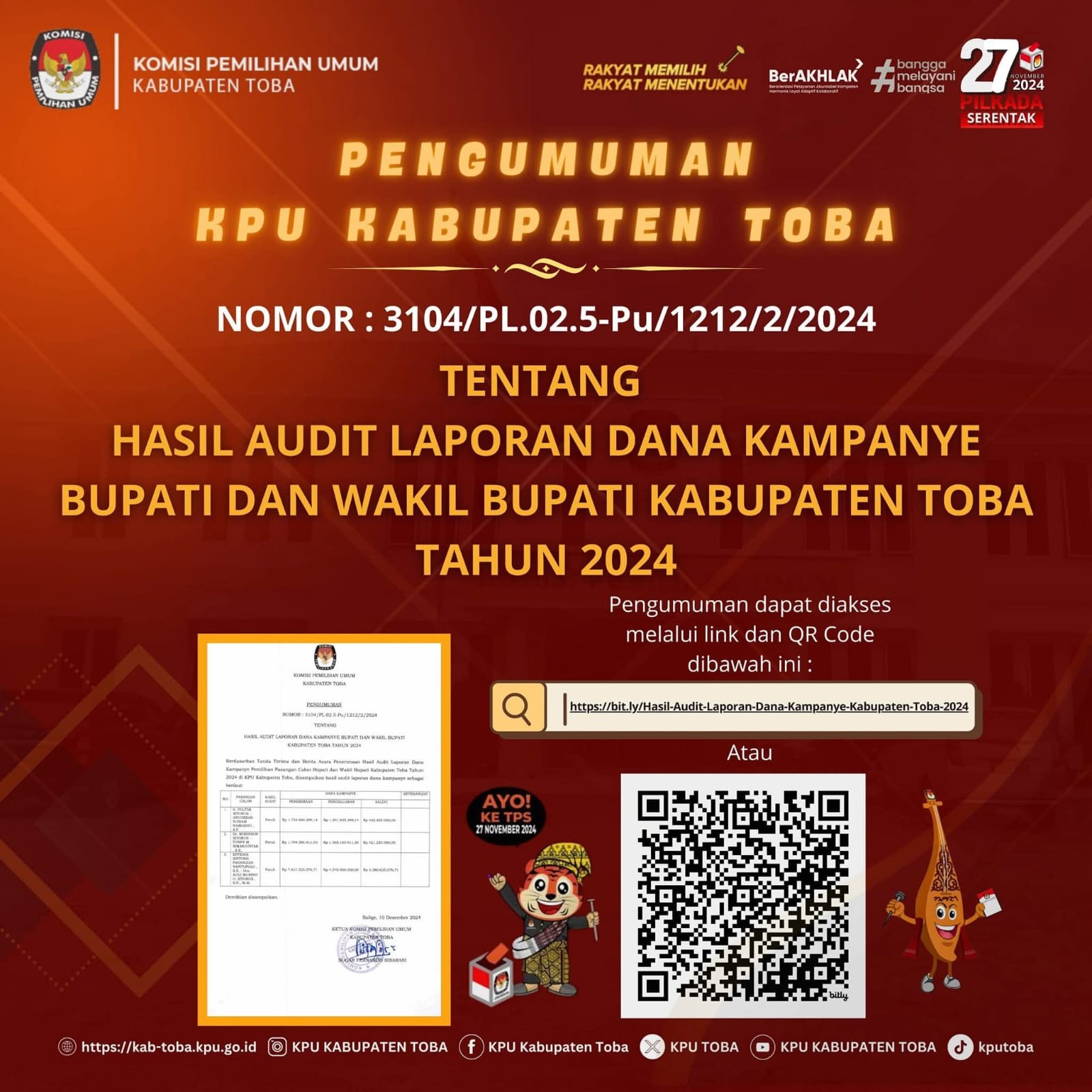 Pengumuman Lelang tersebut dapat diunduh melalui link dibawah ini : https://bit.ly/PengumumanLelangNonEksekusiWajibBMNbrupaPersediaanPascaPemilihanTahun2024KPUToba2