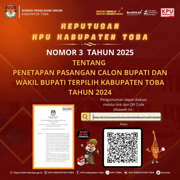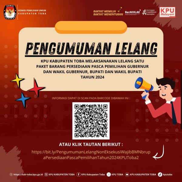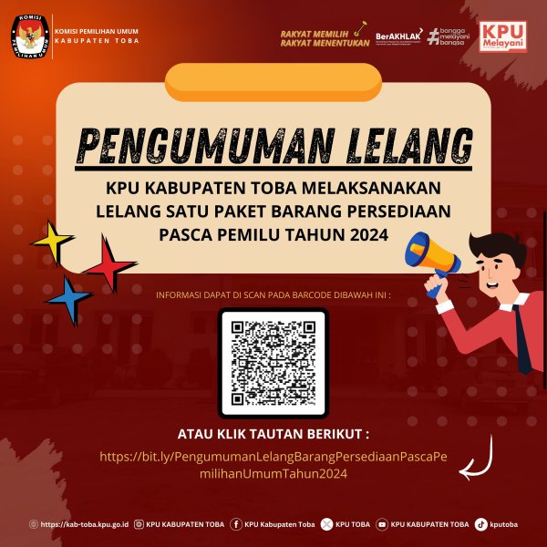 #TemanPemilih, Komisi Pemilihan Umum Kabupaten Toba akan melaksanakan Lelang Noneksekusi Wajib Barang Milik Negara melalui Kantor Pelayanan Kekayaan Negara dan Lelang (KPKNL) Pematang Siantar berupa 1 (satu) paket Barang Persediaan Pasca Pemilihan Gubernur dan Wakil Gubernur, Bupati dan Wakil Bupati Tahun 2024.