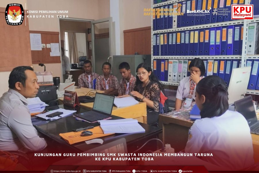 #TemanPemilih, Kunjungan Guru Pembimbing SMK Swasta Indonesia Membangun Taruna ke KPU Kabupaten Toba. Balige, Kamis (26/2/2026). Setelah selesainya kunjungan Guru Pembimbing dari SMK Swasta Rakyat Meranti Timur, Kecamatan Pintu Pohan Meranti pada Senin lalu tgl.23 Februari 2026 yang lalu, kembali KPU Kabupaten Toba dikunjungi Guru Pembimbing dari SMK Swasta Yapim Taruna pada hari Kamis, tgl.26 Februari 2026 oleh May Rosa Simangunsong, S.Pd yang diterima langsung perwakilan dari Sekretariat KPU Kabupaten Toba melalui Kepala Sub Bagian membidangi SDM, Frans L. Sitinjak diruang kerjanya. Dalam kunjungan ini, Rosa menyampaikan "bahwa tujuan utama guru pembimbing melakukan monitoring ke KPU Kabupaten Toba sebagai tempat PKL siswa/i nya adalah untuk memantau perkembangan kompetensi, kedisiplinan, dan kondisi siswa/i, serta memastikan kesesuaian antara kurikulum sekolah dengan aktivitas kerja di kantor KPU Kabupaten Toba. Selain itu Rosa menambahkan monitoring ini bertujuan menjalin kerjasama, mengatasi kendala sisw/i, dan memastikan tujuan pendidikan tercapai secara optimal". Sebanyak 5 siswa/i dari SMK Swasta Yapim Taruna yang di monitoring adalah Alisa Amelia Sibarani, Ester Melinda Gulo, Reza Francisco Purba Tanjung, Rey Pangaribuan, dan Jhoel Hutapea. Melalui Kasubbag SDM KPU Kabupaten Toba, menyambut baik kunjungan ini sebagai bagian dari dukungan terhadap dunia pendidikan dan pembinaan generasi muda, khususnya dalam memberikan pengalaman kerja nyata di lingkungan instansi pemerintah. Diharapkan melalui kegiatan PKL ini, para siswa/i dapat memperoleh pengetahuan, keterampilan, serta wawasan tentang tata kelola kelembagaan dan administrasi kepemiluan yang bermanfaat bagi pengembangan kompetensi mereka ke depan dalam memasuki dunia kerja nyata. #KPUMelayani