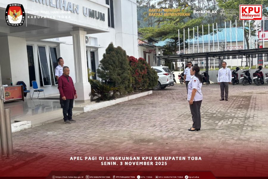 Apel pagi di lingkungan KPU Kabupaten Toba dipimpin oleh Ketua KPU Kabupaten Toba Sugar Fernando Sibarani dengan Komandan Apel Kasubbag Perdatin Haryanti Simarmata. Apel juga dihadiri Kasubbag KUL Mardona Sinaga, Kasubbag SDM Frans L. Sitinjak, dan seluruh jajaran pegawai ASN Sekretariat KPU Kabupaten Toba beserta siswa/i PKL.