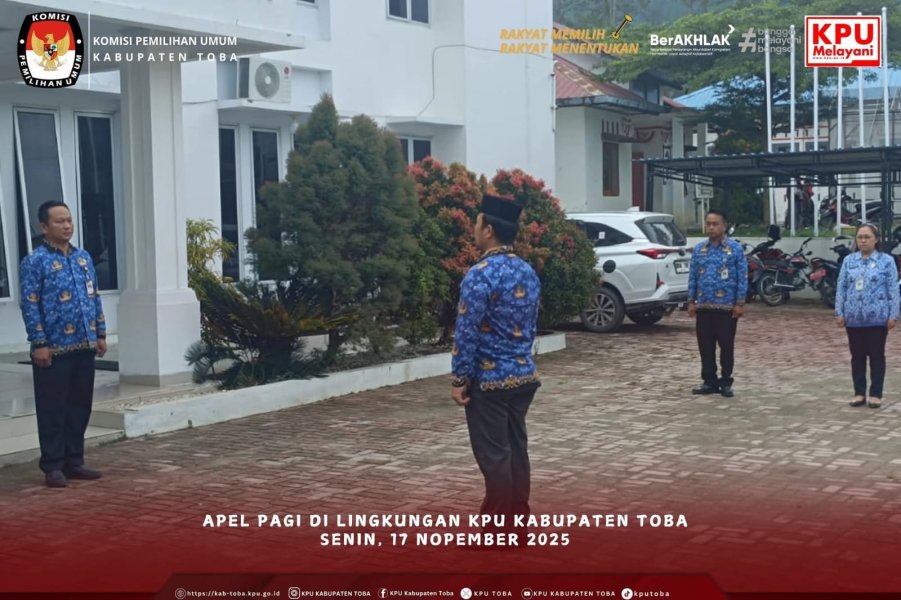 Apel pagi di lingkungan KPU Kabupaten Toba dipimpin oleh Sekretaris KPU Kabupaten Toba Richardo F. Butarbutar dengan Komandan Apel Kasubbag SDM Frans Laurensus Sitinjak, kemudian petugas untuk Pembacaan teks UU'45 Erick Michael dengan Protokol Yuni S. Silalahi. Apel juga dihadiri para Eselon IV, Kasubbag KUL Mardona Sinaga, Kasubbag Perdatin Haryanti Simarmata, Kasubbag Teknis Penyelenggaraan Mindo H. Simbolon maupun seluruh pegawai ASN Sekretariat KPU Kabupaten Toba beserta siswa/i PKL.