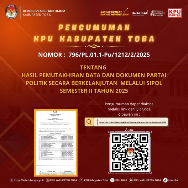 Pengumuman KPU Kabupaten Toba Nomor : 796/PL.01.1-Pu/1212/2/2025 tentang Hasil Pemutakhiran Data dan Dokumen Partai Politik Secara Berkelanjutan Melalui Sipol Semester II Tahun 2025.