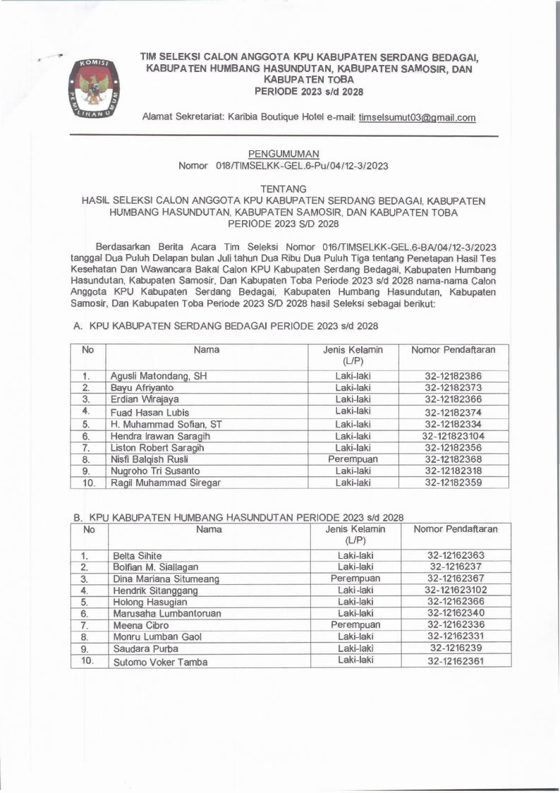 HASIL SELEKSI CALON ANGGOTA KPU KABUPATEN SERDANG BEDAGAI, KABUPATEN HUMBANG HASUNDUTAN, KABUPATEN SAMOSIR, DAN KABUPATEN TOBA PERIODE 2023 S/D 2028