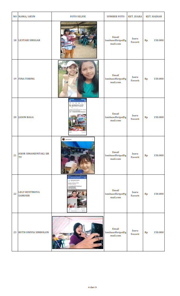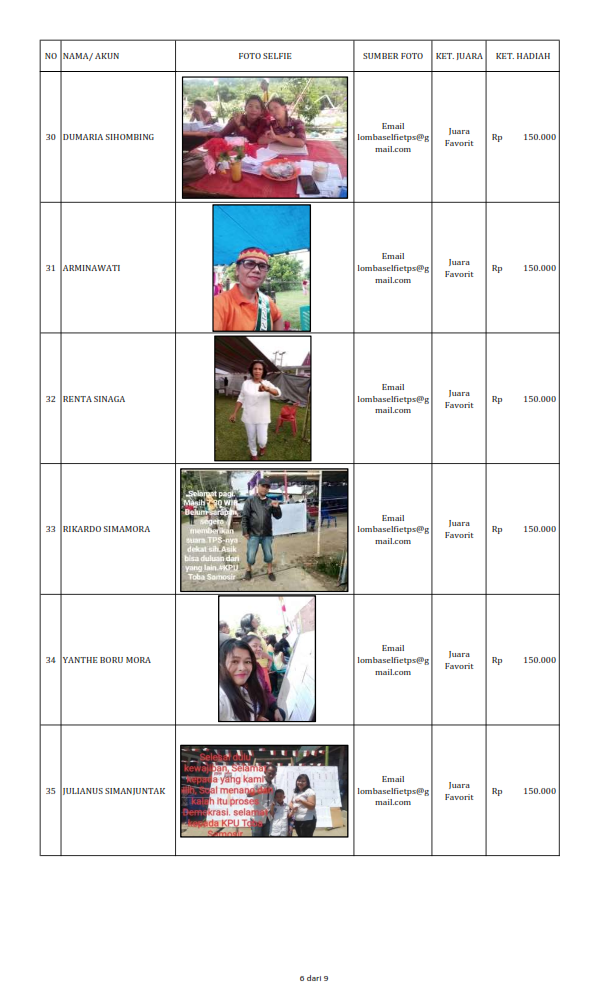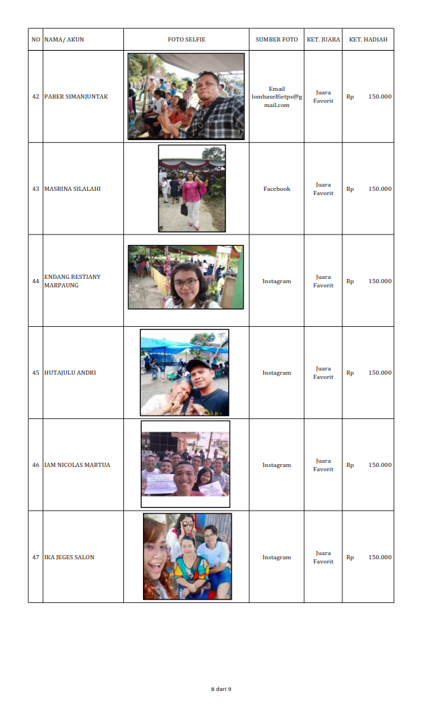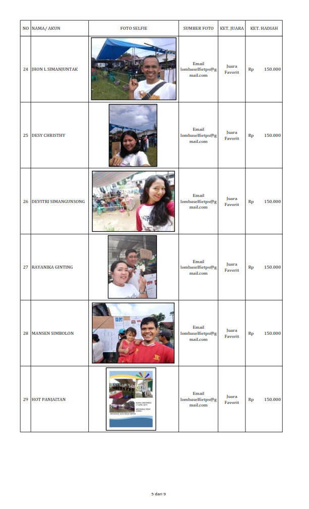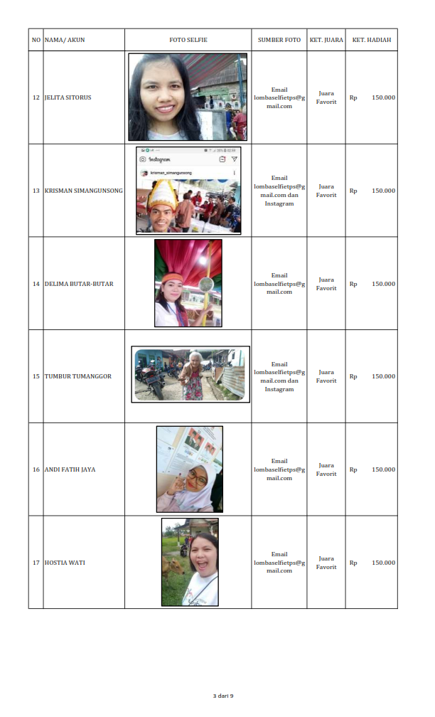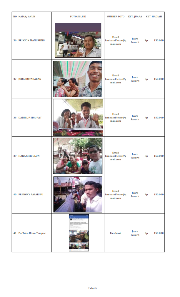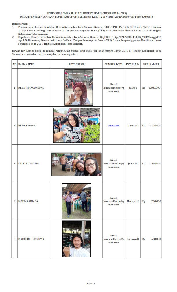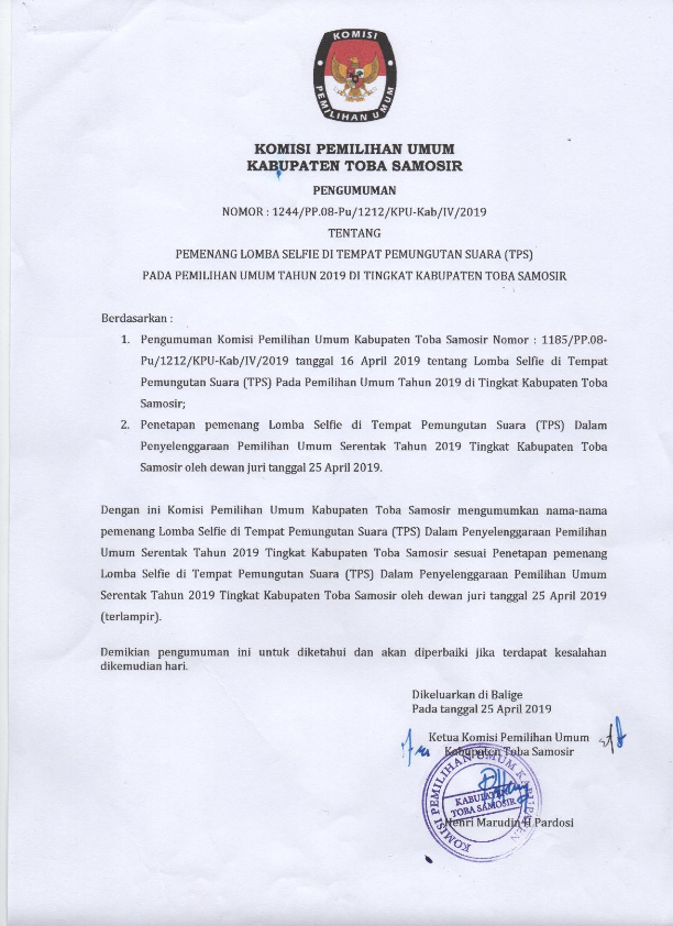 Sesuai dengan pengumuman Lomba Selfie di TPS Tingkat Kabupaten Toba Samosir pada tanggal 16 April 2019 yang lalu, bersama ini KPU Toba Samosir mengumumkan nama-nama/atau akun pemenang Lomba Selfie di TPS Toba Samosir, berdasarkan keputusan dewan juri (terlampir).