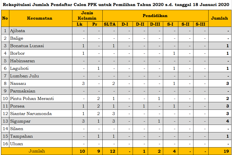 Penerimaan pendaftaran Calon PPK untuk Pemilihan Bupati dan Wakil Bupati Tahun 2020 telah dibuka pada tanggal 18 Januari 2020 Pukul 08.00 WIB bertempat di Kantor KPU Toba Samosir JL. Tarutung Km. 2 Soposurung Balige dan berakhir pada pukul 16.00 WIB. Pada hari pertama jumlah Calon PPK yang mendaftar sebanyak 19 orang yang terdiri dari 10 orang laki-laki dan 9 orang perempuan.