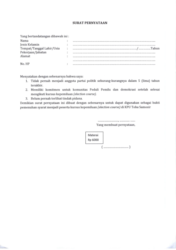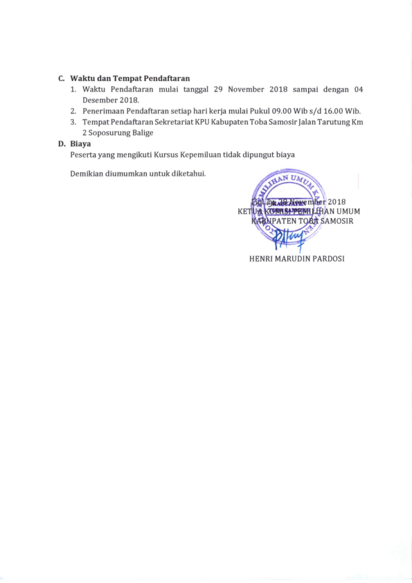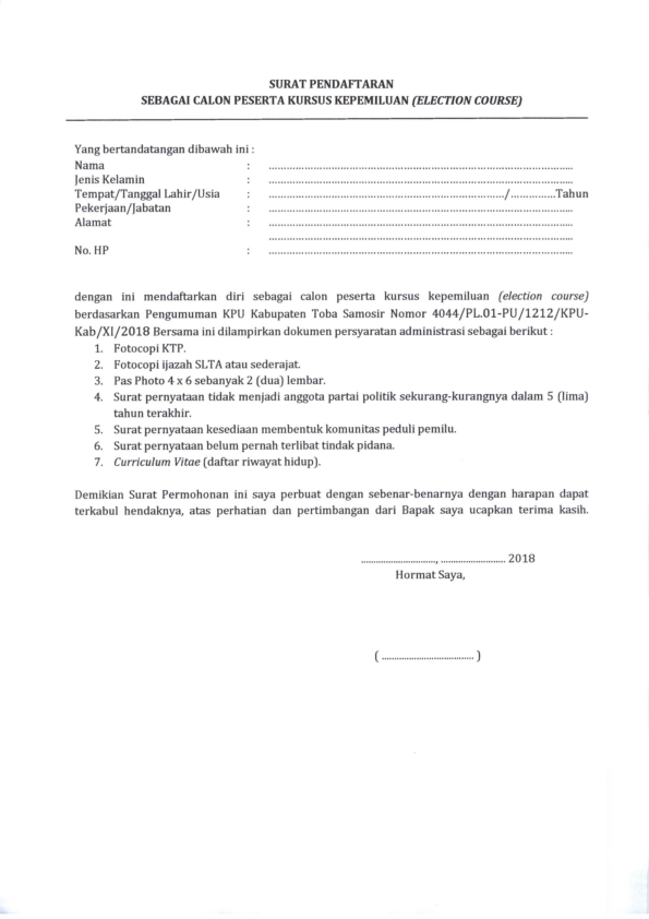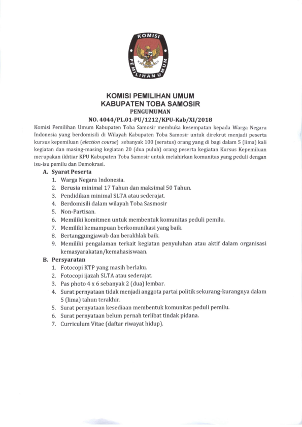 Komisi Pemilihan Umum Kabupaten Toba Samosir membuka kesempatan kepada masyarakat Toba Samosir untuk mengikuti kursus kepemiluan.