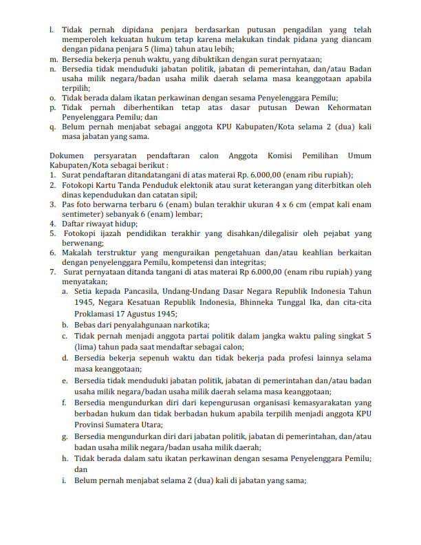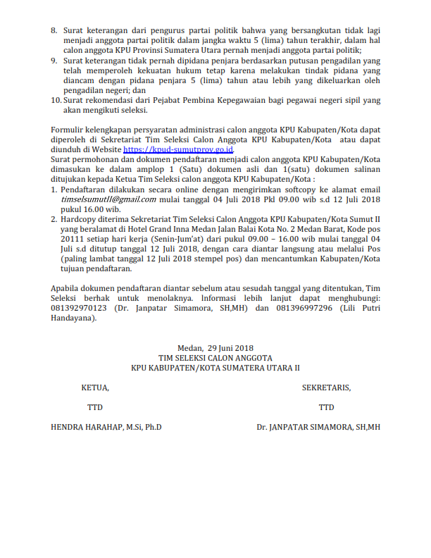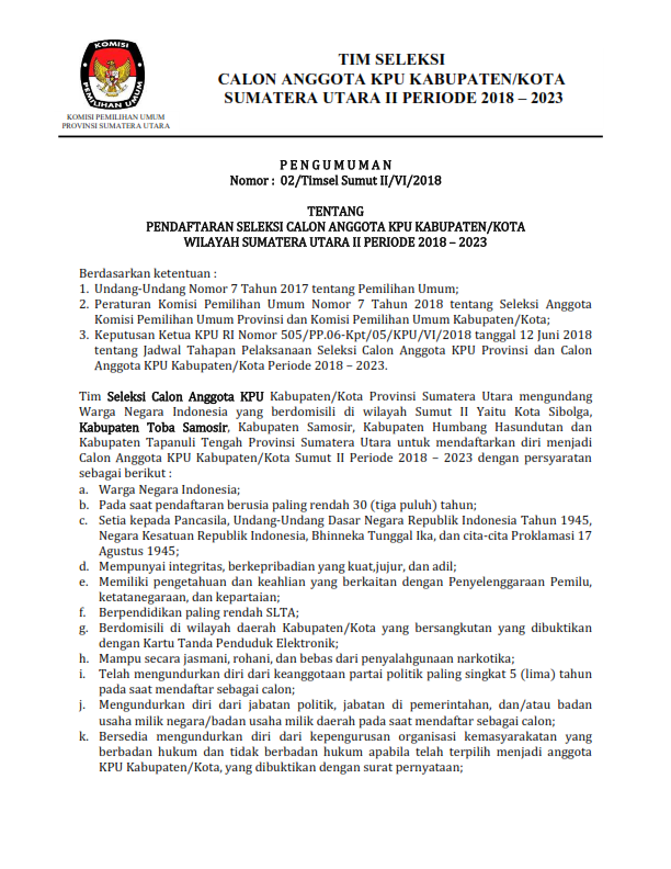 Pengumuman Pendaftaran Seleksi Calon Anggota KPU Kabupaten/Kota Wilayah Sumatera Utara II Periode 2018-2023