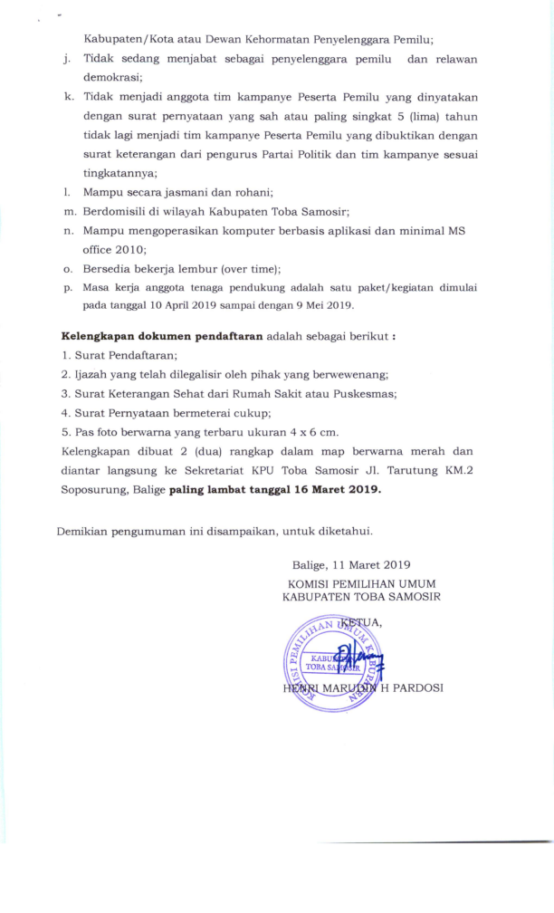 Dalam rangka penyelenggaraan penghitungan perolehan suara pada Pemilihan Umum Serentak Tahun 2019, Komisi Pemilihan Umum Kabupaten Toba Samosir akan melaksanakan perekrutan tenaga pendukung operator aplikasi penghitungan perolehan suara Pemilu 2019 dengan syarat dan ketentuan sesuai pengumuman berikut.