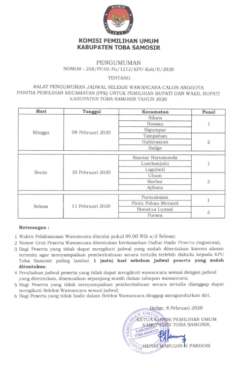 Ralat Pengumuman Jadwal Seleksi Wawancara Calon Anggota Panitia Pemilihan Kecamatan (PPK) untuk Pemilihan Bupati dan Wakil Bupati Kabupaten Toba Samosir Tahun 2020