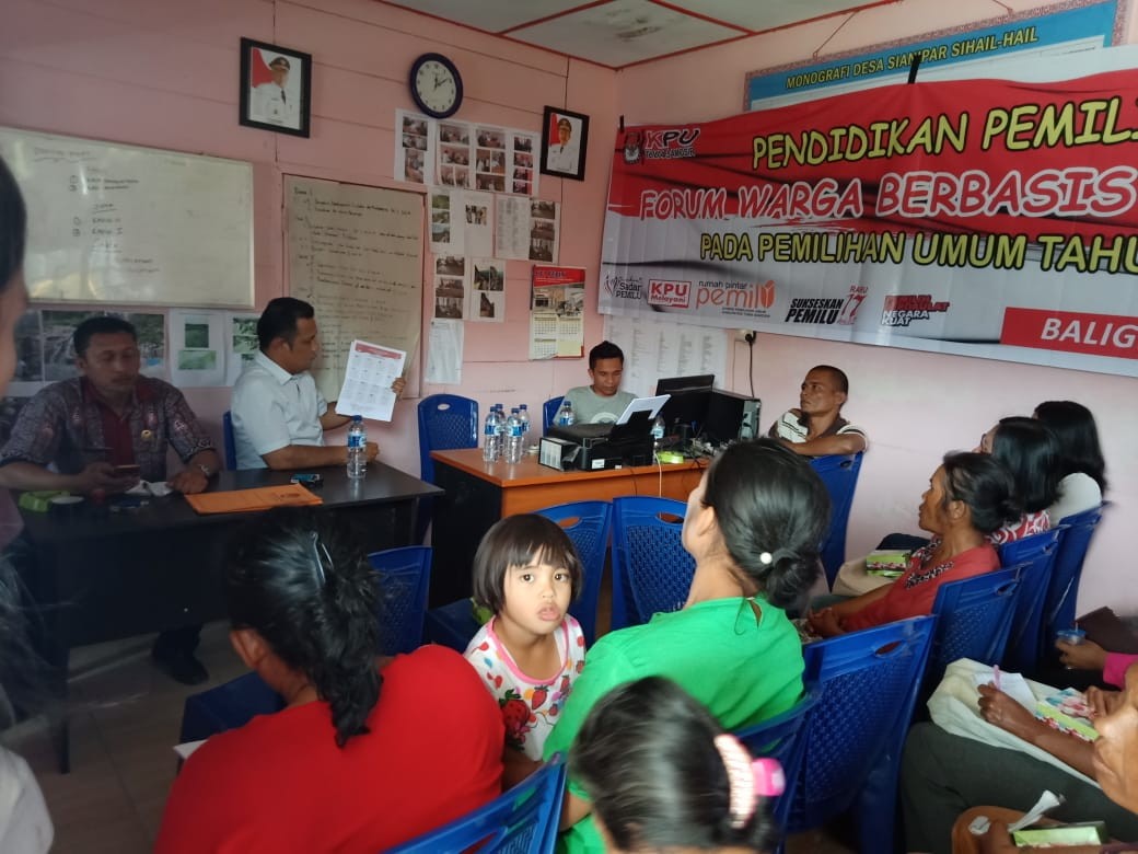 Oleh sebab itu KPU Toba Samosir juga melaksanakan Pendidikan Pemilih Forum Warga Berbasis Keluarga di Desa Pardinggaran Kecamatan Laguboti terhadap ibu-ibu kelompok PKK dan di Kecamatan Ajibata pada hari Minggu tanggal 9 Desember 2018. Tanggal 13 Desember 2018 kegiatan serupa dilaksanakan di Kecamatan Bonatua Lunasi. Sedangkan pada tanggal 15 Desember 2018 kegiatan serupa dilaksanakan di 4 kecamatan yaitu Kecamatan Porsea, Siantar Narumonda, Sigumpar dan Tampahan. Kemudian pada tanggal 16 Desember 2018 kegiatan pendidikan pemilih berbasis keluarga dilaksanakan di Kecamatan Borbor, Desa Matio Kec. Habinsaran, Parmaksian, Silaen dan Kecamatan Uluan. Pada tanggal 18 Desember 2018 kegiatan ini dilaksanakan di Desa Hinalang Kecamatan Balige, Desa Sionggang Utara Kecamatan Lumban Julu dan Desa Lumban Ruhap Kecamatan Habinsaran. Di Kecamatan Porsea kegiatan ini dilaksanakan di Desa Siraituruk terhadap kelompok Parmalim dan kepada kelompok perwiritan Al-Hidayah pada tanggal 20 Desember 2018. Pada hari yang sama kegiatan ini juga dilaksanakan di Desa Lumban Gaol dan Desa Sianipar Sihail-Hail Kecamatan Balige. Pada tanggal 21 Desember 2018 kegiatan dilaksanakan di Kecamatan Nassau dan di Desa Dolok Nagodang Kecamatan Uluan.