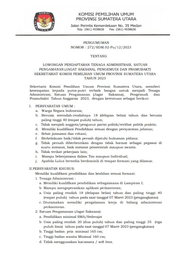 Administrasi, Satuan Pengamanan (Jagat Saksana), Pengemudi dan Pramubakti Tahun Anggaran 2023, dengan syarat umum sebagai berikut :