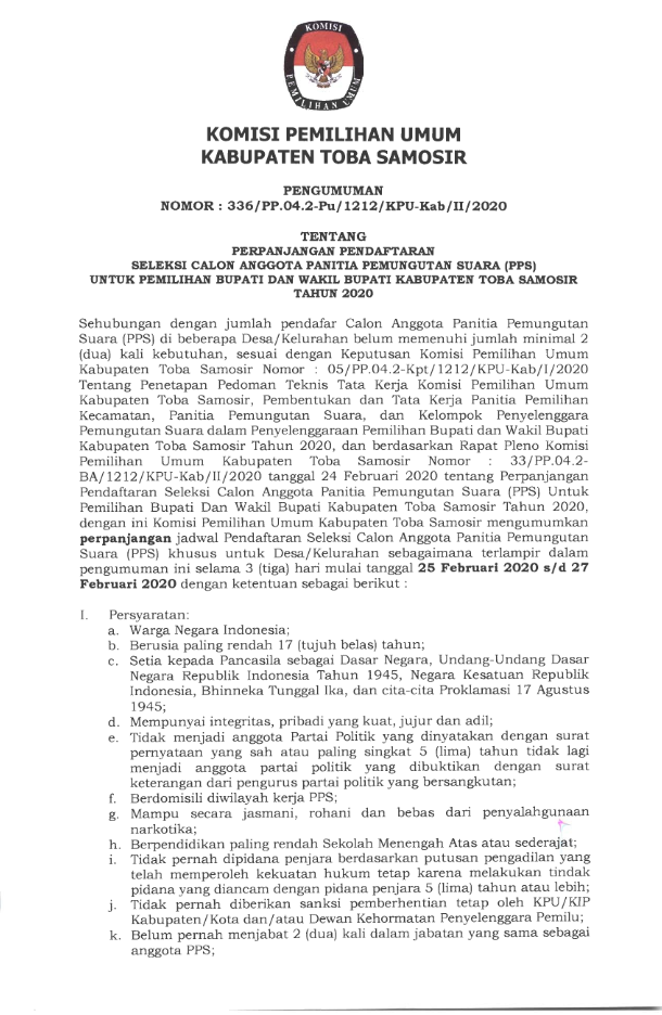 KPU Kabupaten Toba Samosir memberikan kesempatan kepada masyarakat untuk memberikan Tanggapan dan Masukan atas Pengumuman Hasil Seleksi Administrasi mulai tanggal 02 Maretd 10 Maret 2020;