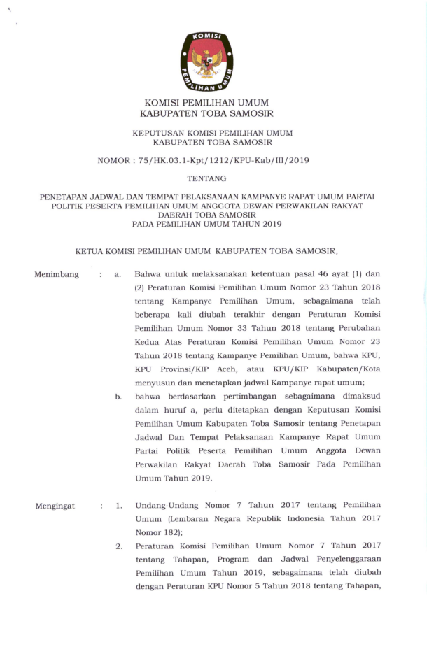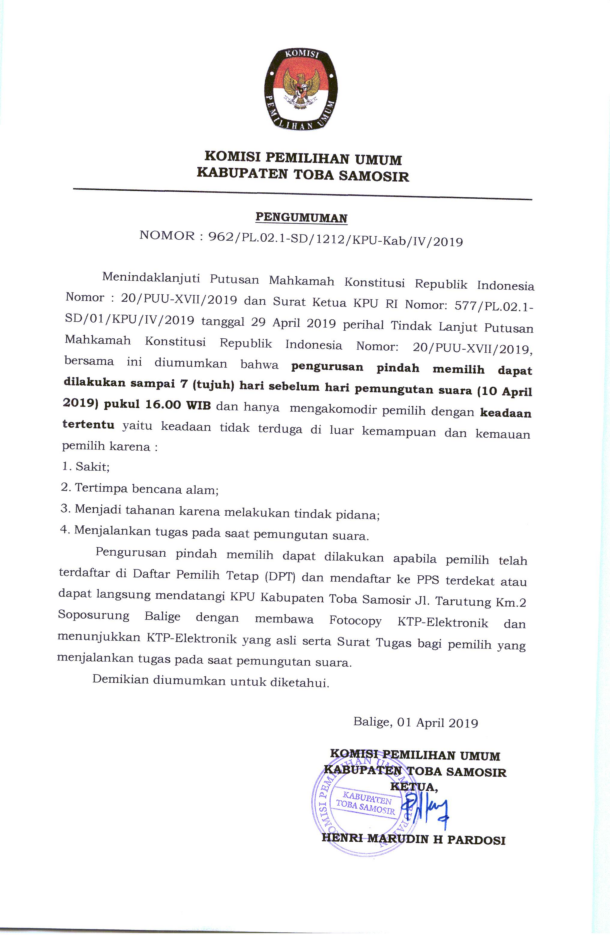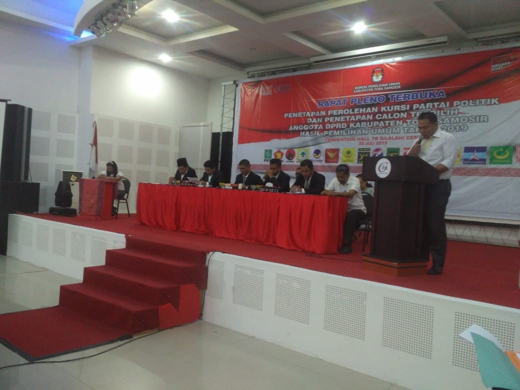 Senin, 22 Juli 2019 bertempat di Convention Hall TB. Silalahi Center, Desa Silalahi Pagar Batu-Balige, KPU Toba Samosir melaksanakan Rapat Pleno Terbuka Penetapan Perolehan Kursi Partai Politik dan Calon Terpilih Anggota Dewan Perwakilan Rakyat Daerah Kabupaten Toba Samosir Pemilihan Umum Tahun 2019. Hasil Rapat Pleno Terbuka dituangkan dalam Berita Acara Nomor : 1957/PL.01.9-BA/1212/KPU-Kab/VII/2019 tentang Penetapan Perolehan Kursi Partai Politik dan Calon Terpilih Anggota Dewan Perwakilan Rakyat Daerah Kabupaten Toba Samosir Pemilihan Umum Tahun 2019 tanggal 22 Juli 2019. Berdasarkan Berita Acara Nomor : 1957/PL.01.9-BA/1212/KPU-Kab/VII/2019 tersebut, KPU Toba Samosir selanjutnya menetapkan calon terpilih dalam Keputusan KPU Toba Samosir Nomor : 101/HK.03.1-Kpt/1212/KPU-Kab/VII/2019 tentang Penetapan Calon Terpilih Anggota Dewan Perwakilan Rakyat Daerah Kabupaten Toba Samosir Dalam Pemilihan Umum Tahun 2019. Daftar Calon Terpilih Anggota Dewan Perwakilan Rakyat Daerah Kabupaten Toba Samosir Dalam Pemilihan Umum Tahun 2019 dapat dilihat pada link berikut: https://drive.google.com/open?id=1uB1dBy3Iww27EqKX8C0u3EMlCfqcdnI1