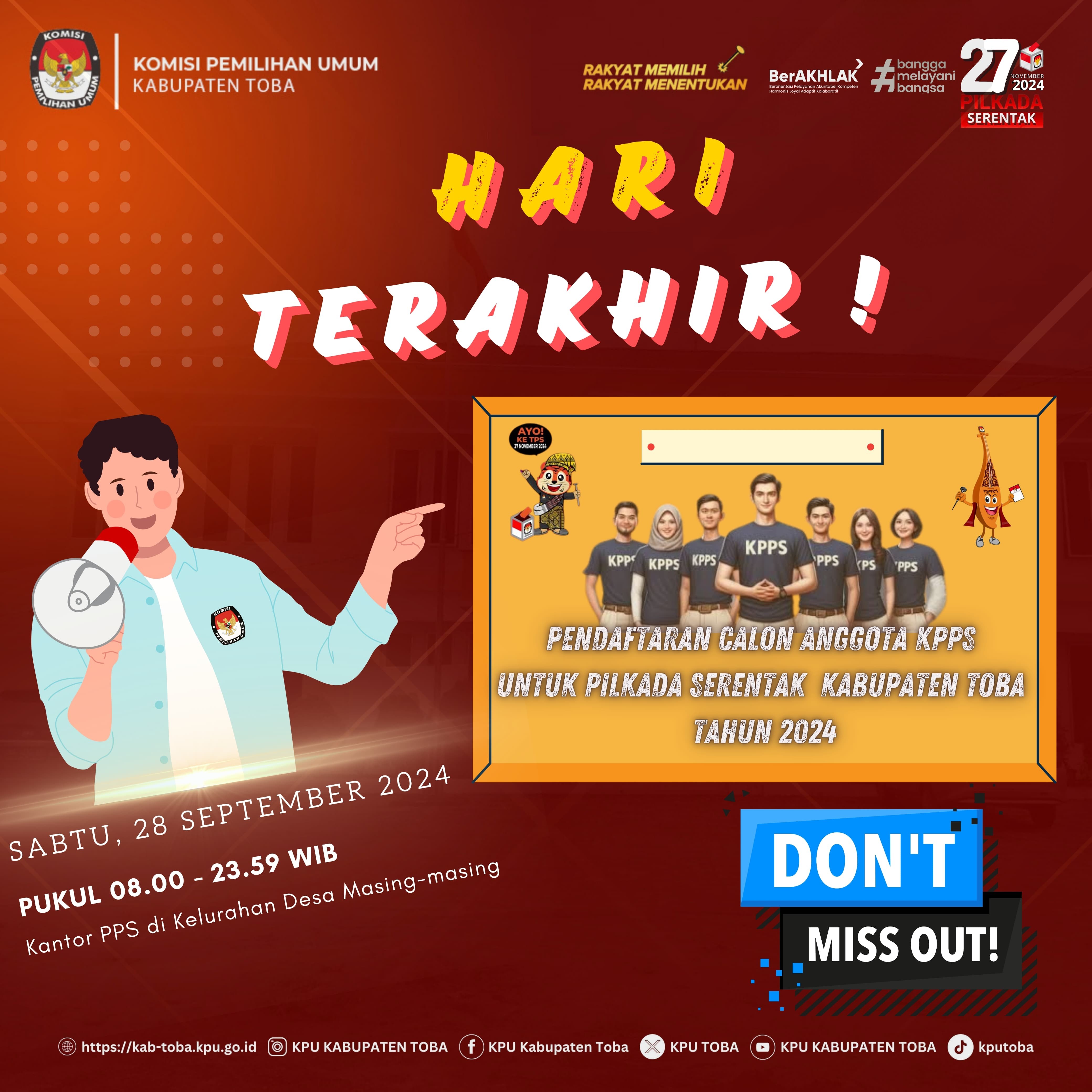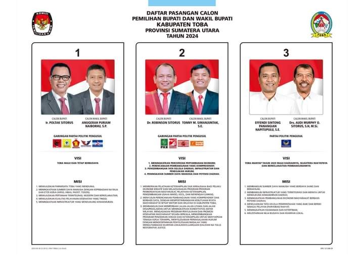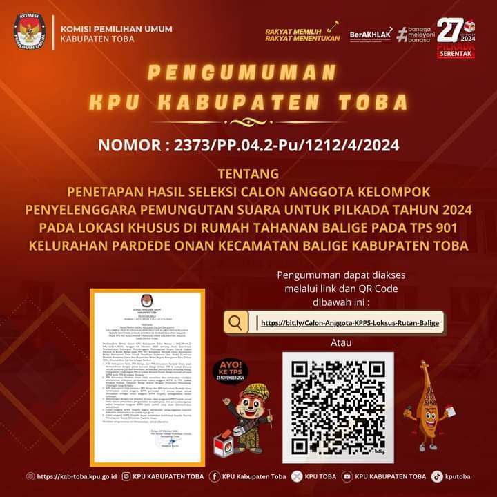 KPU Kabupaten Toba telah mengeluarkan Pengumuman Nomor 2373/PP.04.2-Pu/1212/4/2024 tentang Penetapan Hasil Seleksi Calon Anggota KPPS Terpilih Untuk Pilkada Tahun 2024 Pada Lokasi Khusus Di Rumah Tahanan Balige Pada TPS 901 Kelurahan Pardede Onan, Kecamatan Balige, Kabupaten Toba.