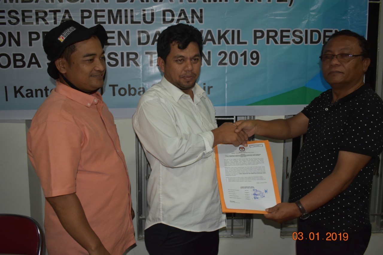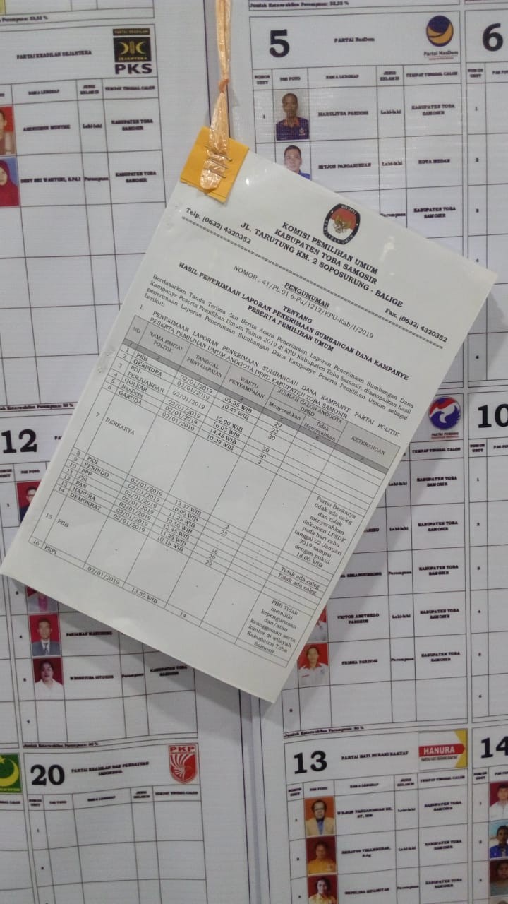 KPU Kabupaten Toba Samosir Melakukan Penerimaan Dokumen LPSDK (Laporan Penerimaan Sumbangan Dana Kampanye) Tingkat Kabupaten Toba Samosir yang disaksikan oleh Bawaslu Kabupaten Toba Samosir. Rabu, 02 Januari 2019 KPU Kabupaten Toba Samosir melakukan penerimaan dokumen Laporan Penerimaan Sumbangan Dana Kampanye peserta Pemilihan Umum Tahun 2019 sebagaimana disebutkan dalam Pasal 42 ayat (4) dan Pasal 43 ayat (4) Peraturan Komisi Pemilihan Umum Nomor 34 Tahun 2018 tentang Perubahan Kedua Atas Keputusan Komisi Pemilihan Umum Nomor 24 Tahun 2018 tentang Dana Kampanye Pemilihan Umum, bahwa Pasangan Calon dan/Tim Kampanye serta Pengurus Partai Politik tingkat nasional, daerah provinsi, dan daerah kabupaten/kota wajib menyampaikan LPSDK kepada KPU, KPU Provinsi/KIP Aceh, dan KPU/KIP Kabupaten/Kota sesuai tingkatannya. Penyampaian LPSDK dimaksud dilakukan pada hari Rabu, tanggal 02 Januari 2019 paling lambat pukul 18.00 Wib. Setelah Peserta Pemilu menyampaikan LPSDK tersebut maka KPU Kabupaten Toba Samosir melalui Tim Peneliti/Petugas Penerima Dokumen melakukan Pencermatan kelengkapan dan kesesuaian format LPSDK dan menuangkan ke dalam Kertas Kerja Pemeriksaan yang kemudian KPU Kabupaten Toba Samosir menyerahkan Berita Acara Hasil Pemeriksaan Penerimaan LPSDK tersebut.