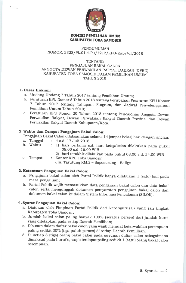 Pengumuman Pengajuan Bakal Calon Anggota DPRD Kabupaten Toba Samosir pada Pemilu Tahun 2019 Minggu, 01 Juli 2018 00:00 366 Baca Selengkapnya