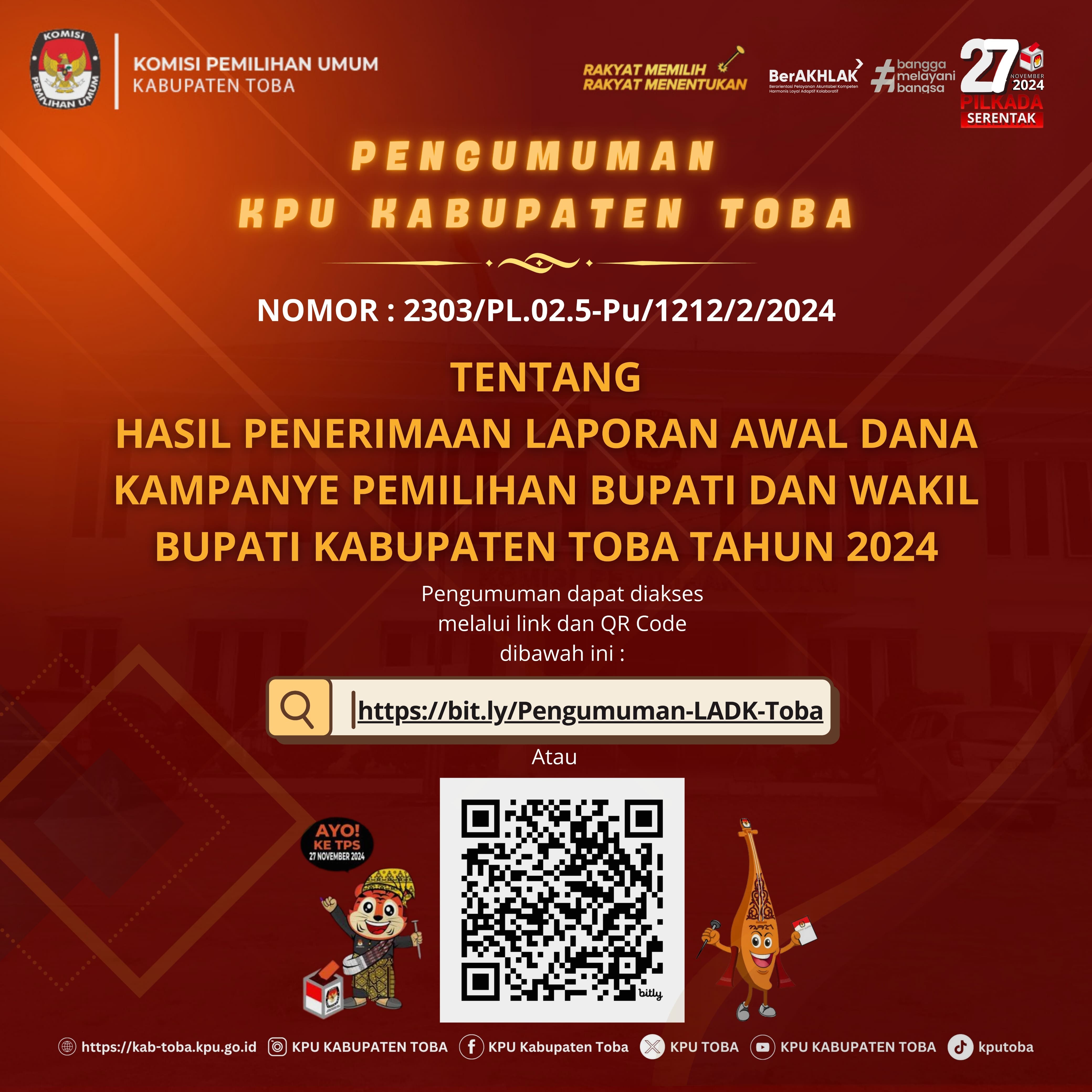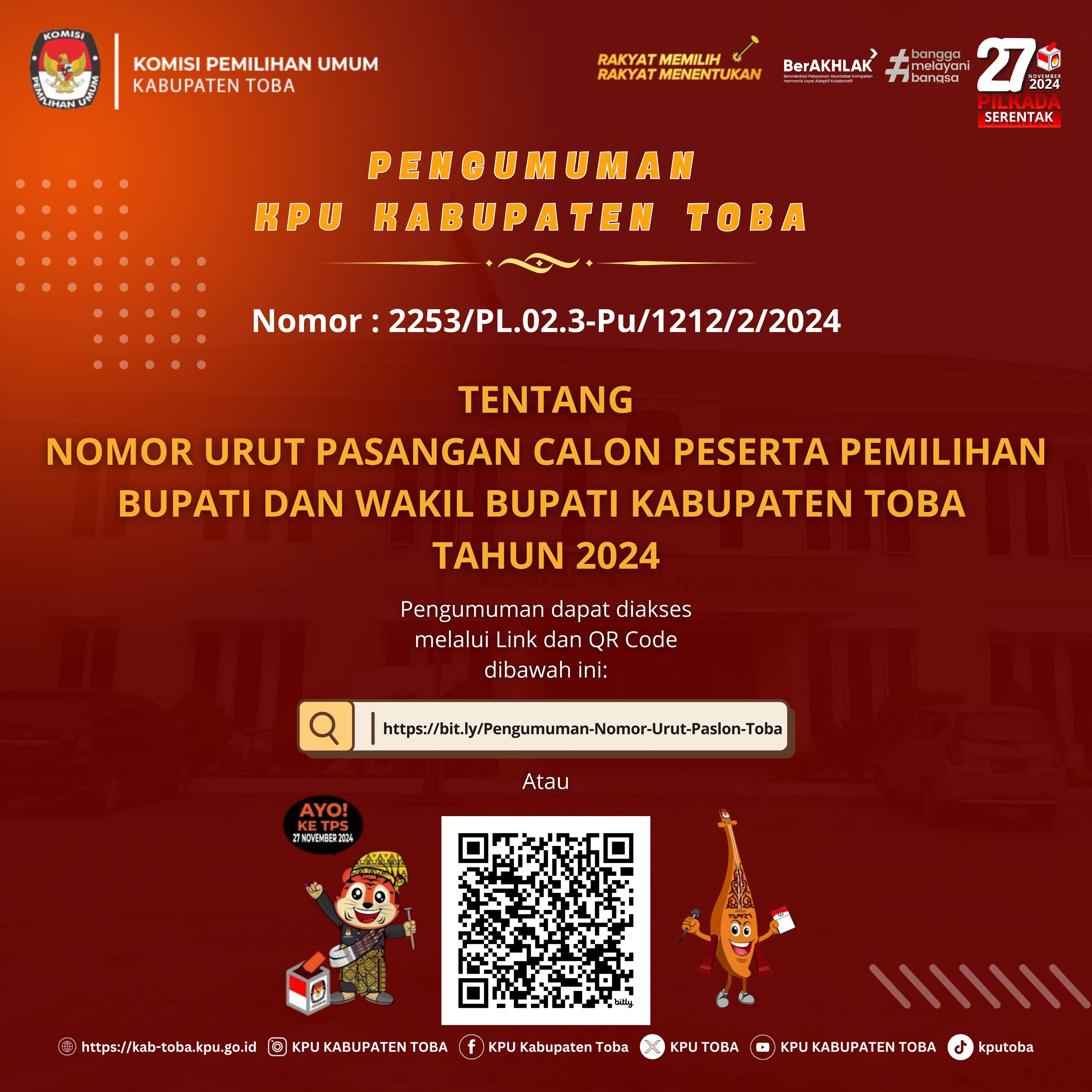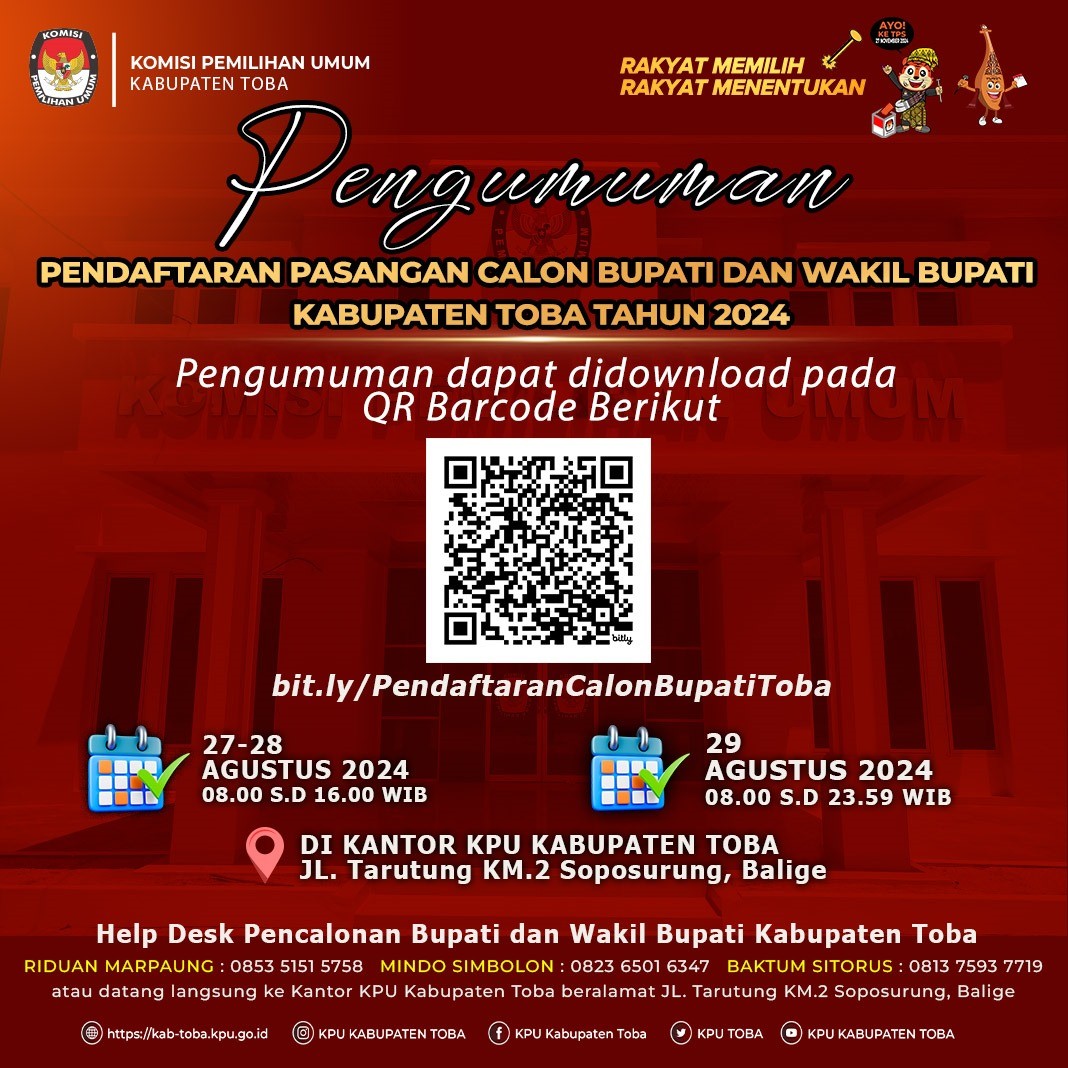 KPU Kabupaten Toba telah membuka Pendaftaran Penerimaan Calon Anggota KPPS Pada Pemilihan Gubernur dan Wakil Gubernur Provinsi Sumatera Utara dan Bupati dan Wakil Bupati Kabupaten Toba Tahun 2024.