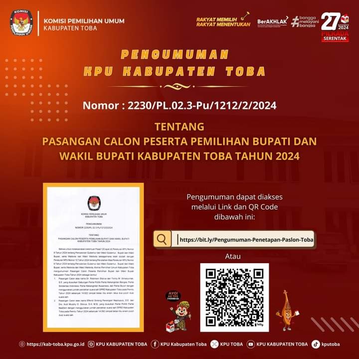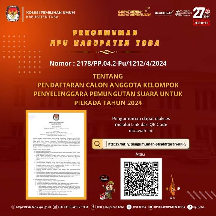 Bagi masyarakat Toba yang akan ikut berpartisipasi untuk mendaftar sebagai calon anggota KPPS pada Pilkada Serentak Tahun 2024, silahkan kunjungi kantor PPS di Desa/Kelurahan masing-masing untuk memperoleh informasi lebih lanjut.