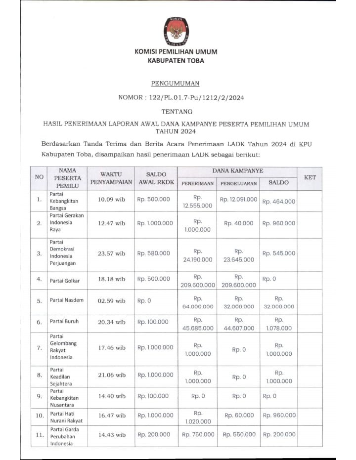 Komisi Pemilihan Umum Kabupaten Toba telah menerima Laporan Awal Dana Kampanye (LADK) Partai Politik Peserta Pemilu Tahun 2024 pada tanggal 7 Januari 2024 dan berakhirnya tahapan LADK Perbaikan pada tanggal 12 Januari 2024, berdasarkan PKPU 18 Tahun 2023 pasal 88 KPU, KPU Provinsi, dan KPU Kabupaten/Kota mengumumkan LADK paling lambat 1 (satu) Hari setelah periode penerimaan LADK perbaikan berakhir sebagaimana dimaksud dalam pasal 85 ayat (1) pada papan pengumuman dan laman KPU, KPU Provinsi, dan KPU Kabupaten/Kota.