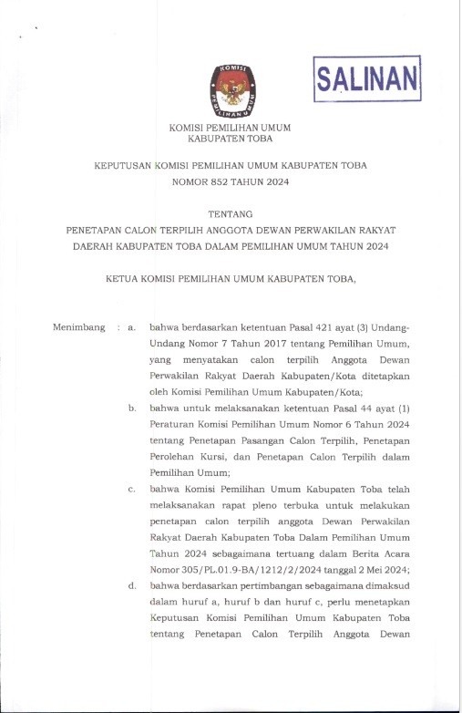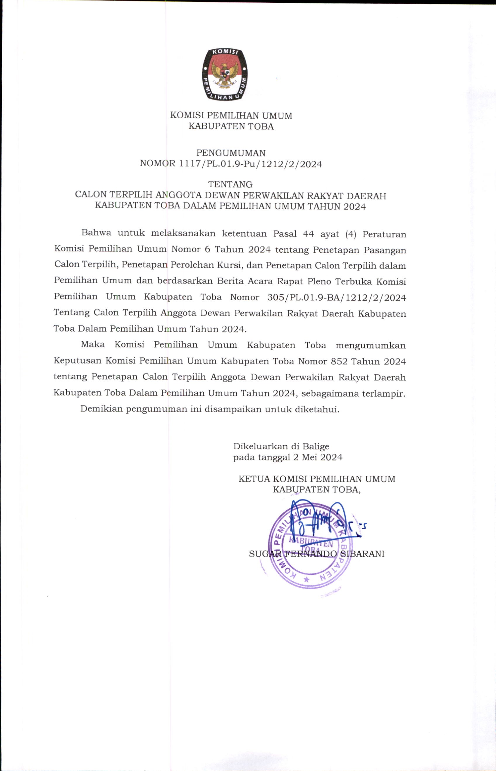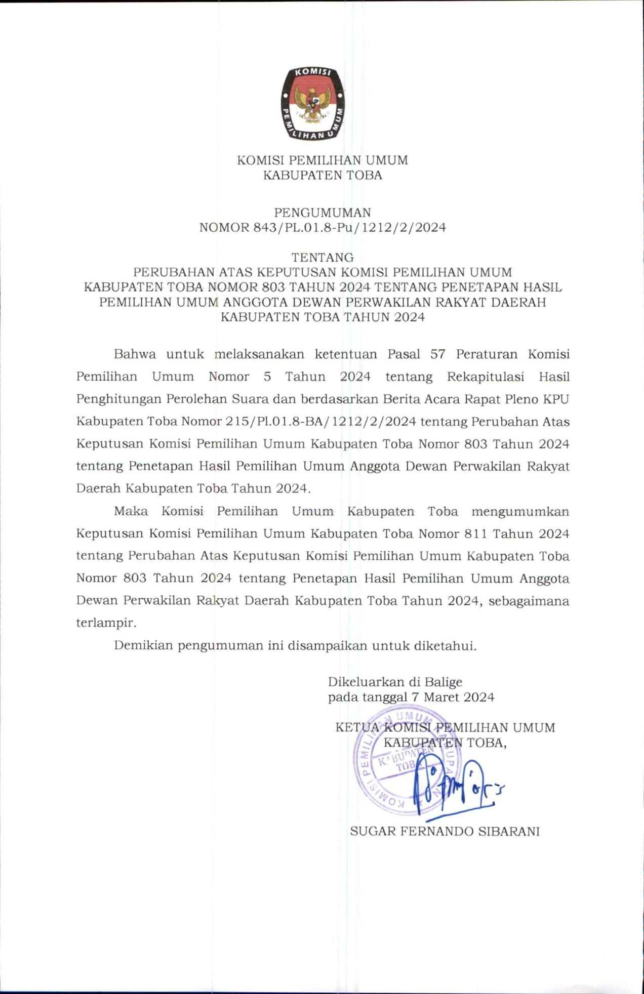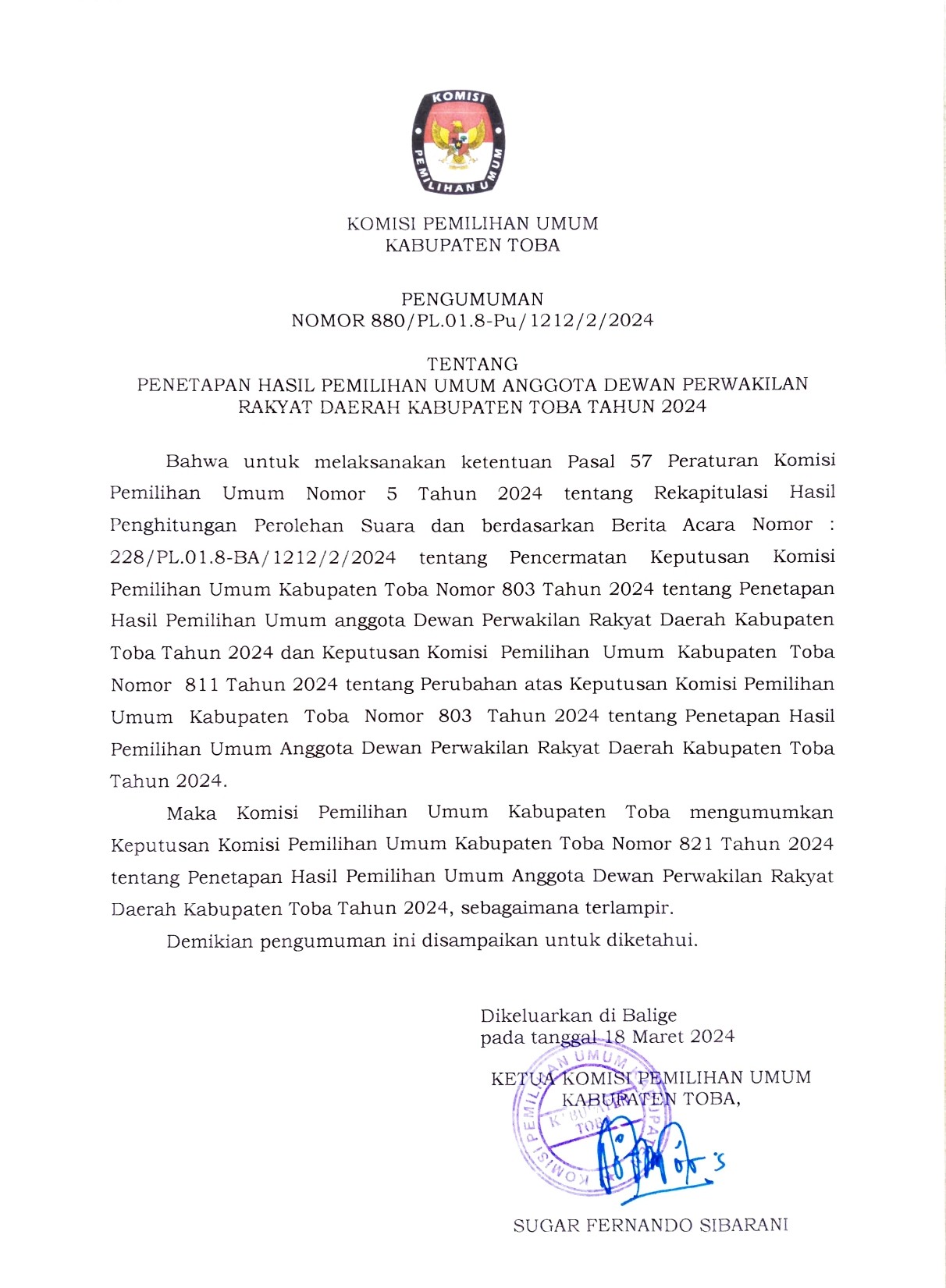 Sehubungan dengan hal tersebut Komisi Pemilihan Umum Kabupaten Toba Mengumumkan Hasil Penerimaan Laporan Awal Dana Kampanye Peserta Pemilihan Umum Tahun 2024, Pengumuman Nomor : 122/PL.01..7-Pu/1212/2/2024, terlampir.