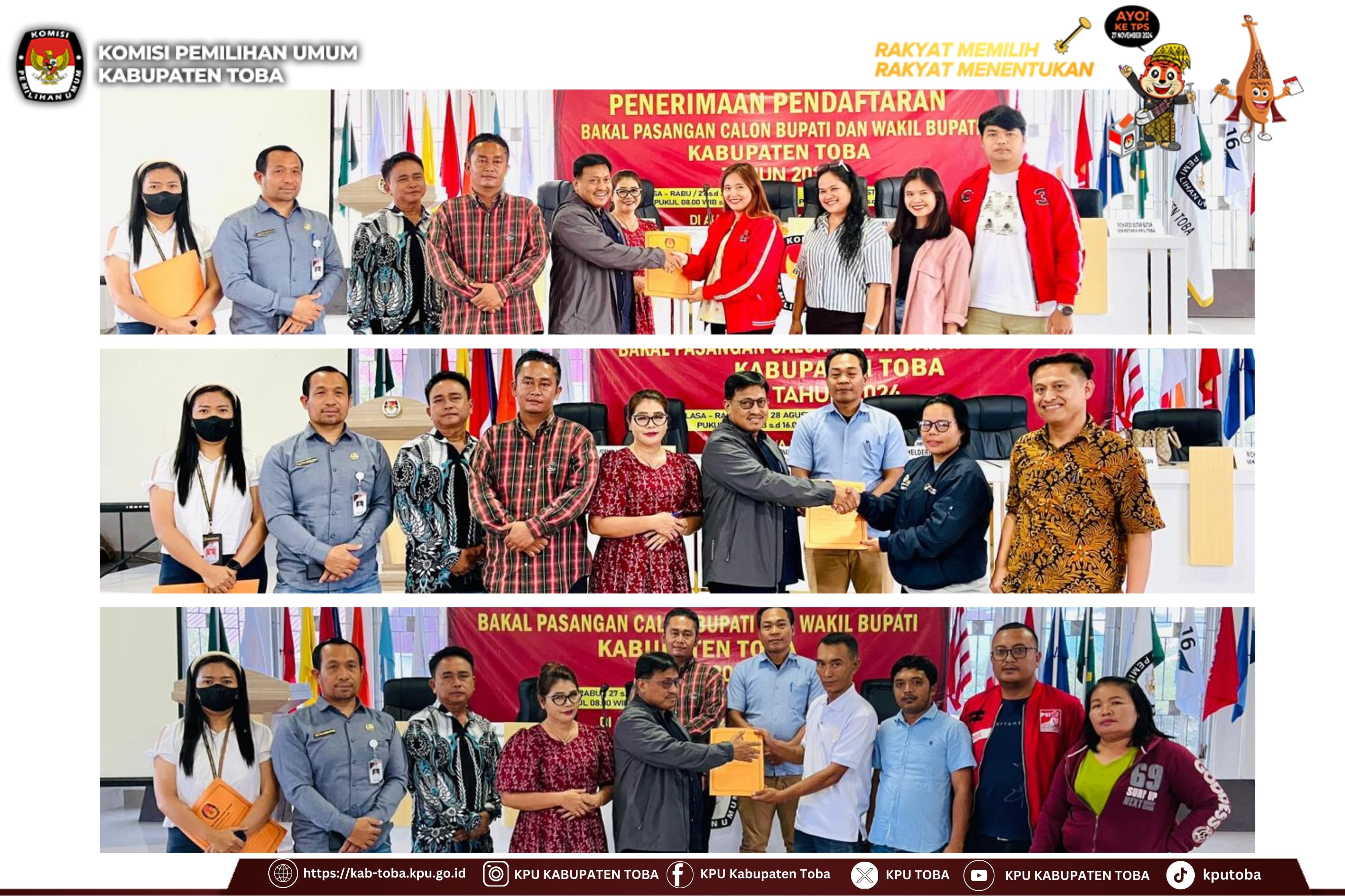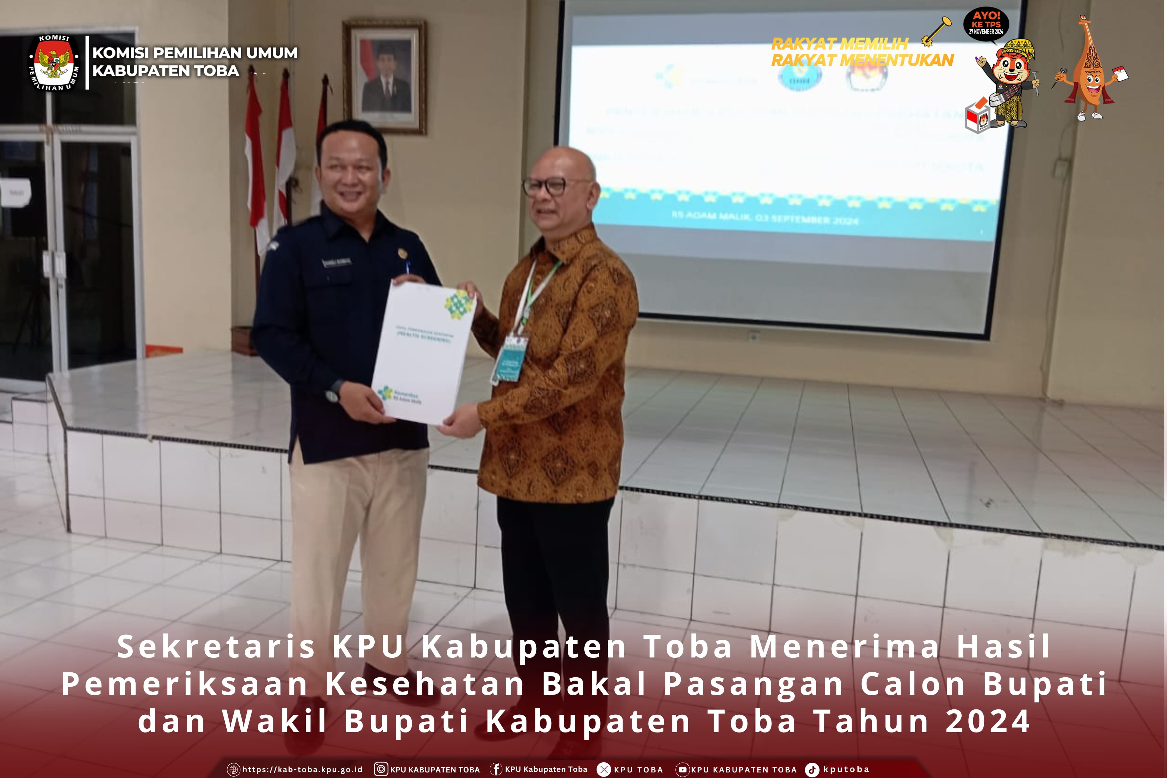 "Talkshow" Siaran Tunda bersama iNews Sumut. Medan, Jumat (6/9/2024). Dalam rangka mendukung suksesnya tahapan Pilkada Tahun 2024, iNews Sumut mengundang KPU Kabupaten Toba melaksanakan program "Talkshow" Siaran Tunda. Hadir sebagai narasumber anggota KPU Kabupaten Toba yang membidangi Sosialisasi, Pendidikan Pemilih, Partisipasi Masyarakat, dan Sumber Daya Manusia Helderia Purba, dan Riduan Marpaung membidangi Teknis Penyelenggaraan, yang dilaksanakan hari Jumat tanggal 6 September 2024 di Studio iNews Sumut, Jalan Intertip No.1 Kompleks Wartawan Medan. Turut hadir mendampingi Kepala Sub Bagian yang membidangi tugas, fungsi, dan kewenangan bidang Partisipasi, Hubungan Masyarakat, dan Sumber Daya Manusia Frans Laurensus Sitinjak beserta staf Sekretariat Sintauli Rajagukguk. Dalam kesempatan tersebut Helderia menyampaikan kesimpulan bahwa sosialisasi sebagaimana disebutkan dalam Peraturan dan Keputusan KPU merupakan kunci utama dalam meningkatkan partisipasi pemilih baik pada penyelenggaraan tahapan Pemilu maupun Pemilihan, kemudian Riduan menambahkan bahwa KPU Kabupaten Toba juga aktif melaksanakan koordinasi dengan pihak stakeholder dalam setiap tahapan demi suksesnya Pilkada Kabupaten Toba Tahun 2024. KPUMelayani SuksesPilkada2024