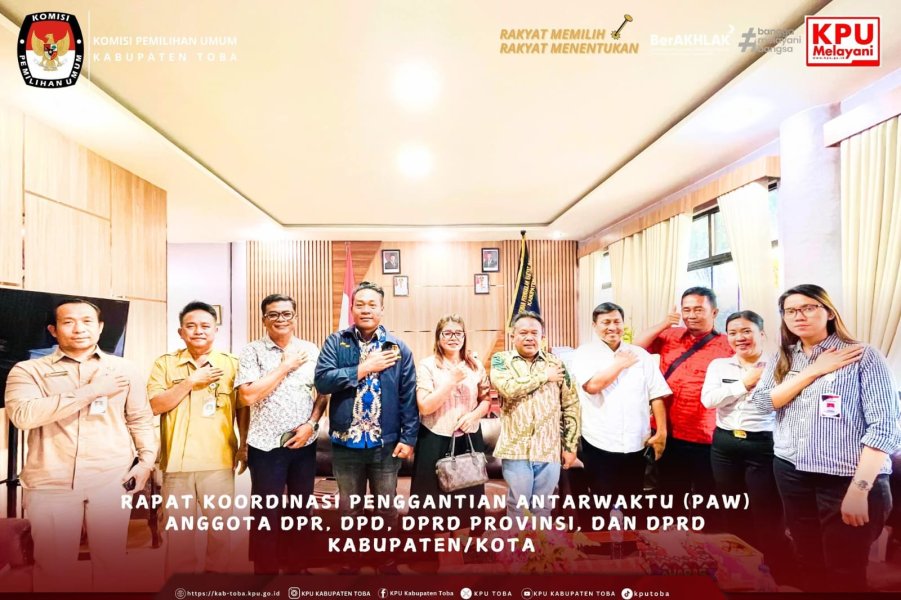 #TemanPemilih, Rapat Koordinasi Penggantian Antarwaktu (PAW) Anggota DPR, DPD, DPRD Provinsi, dan DPRD Kabupaten/Kota, Balige. Selasa (16/9/2025). KPU Kabupaten Toba yang terdiri dari anggota KPU Kabupaten Toba Riduan Marpaung, Helderia Purba, Posman Naiborhu, Erikson Sitorus didampingi jajaran Sekretariat KPU Kabupaten Toba melaksanakan Rapat Koordinasi Penggantian Antarwaktu Anggota DPR, DPD, DPRD Provinsi, dan DPRD Kabupaten/Kota ke DPRD Kabupaten Toba yang diterima langsung oleh Ketua DPRD Kabupaten Toba Franshendrik Tambunan diruang kerjanya didampingi oleh Plt. Sekretaris DPRD Kabupaten Toba Donald Simanjuntak. Dalam rapat koordinasi tersebut, Riduan menyampaikan bahwa penting untuk menerima masukan maupun saran terkait pelaksanaan Pemilu dan Pilkada Tahun 2024. Sebagai bahan sosialisasi, Helderia menyampaikan hardcopy atau materi terkait Rumusan Kebijakan Pada Peraturan KPU tentang Penggantian Antarwaktu anggota DPR, DPD, DPRD Provinsi, dan DPRD Kabupaten/Kota, yang diterima langsung oleh Franshendrik. Diakhir pertemuan, Franshrendrik menambahkan terimakasih kepada KPU Kabupaten Toba atas pelaksanaan kegiatan Rapat Koordinasi Penggantian Antarwaktu tersebut, dan sangat berharap pelaksanaan Pemilu dan Pilkada di masa yang akan datang menjadi lebih baik. #KPUMelayani