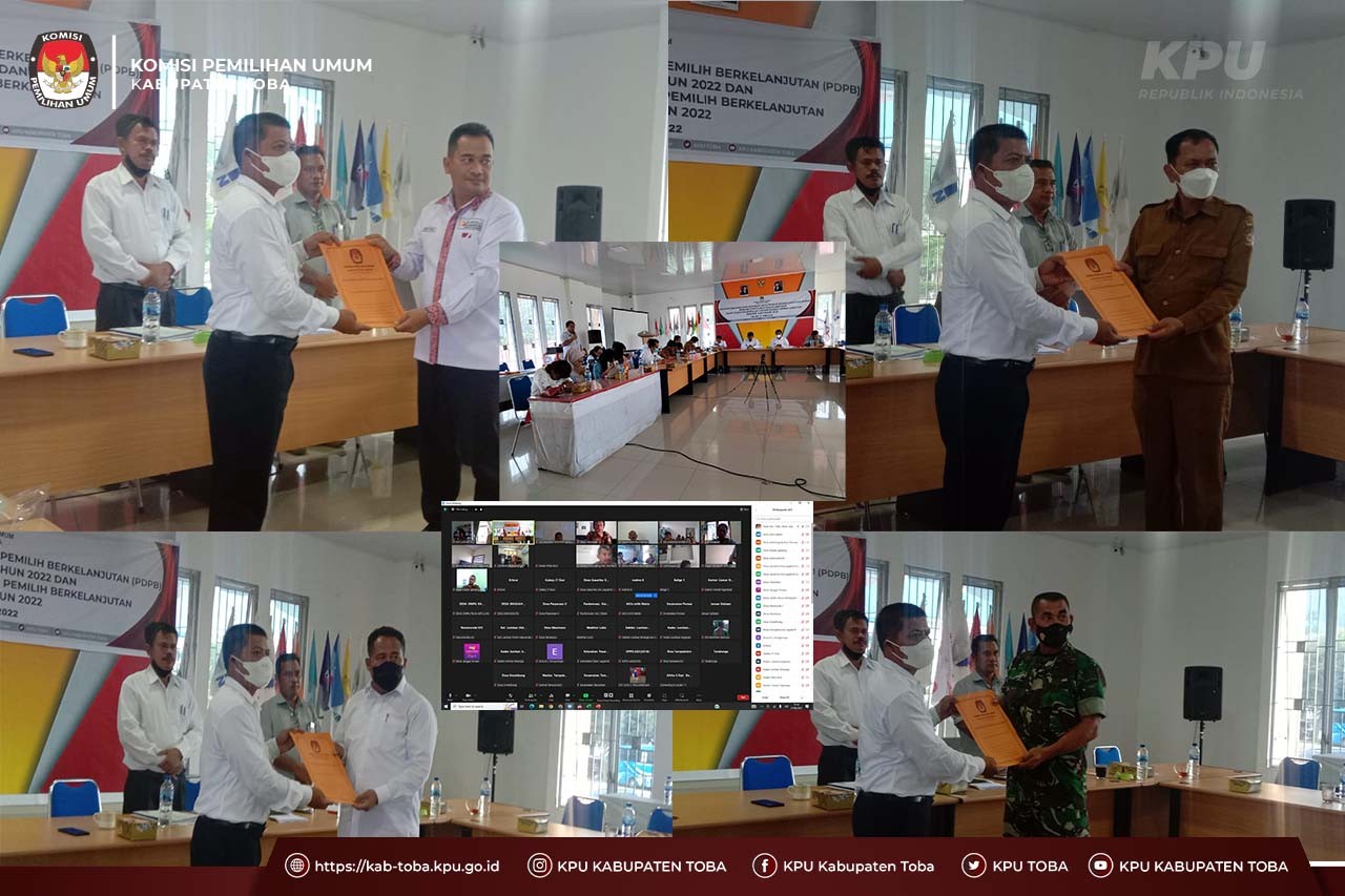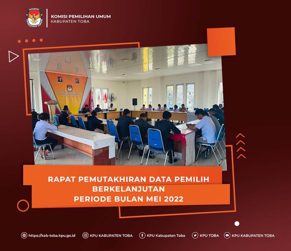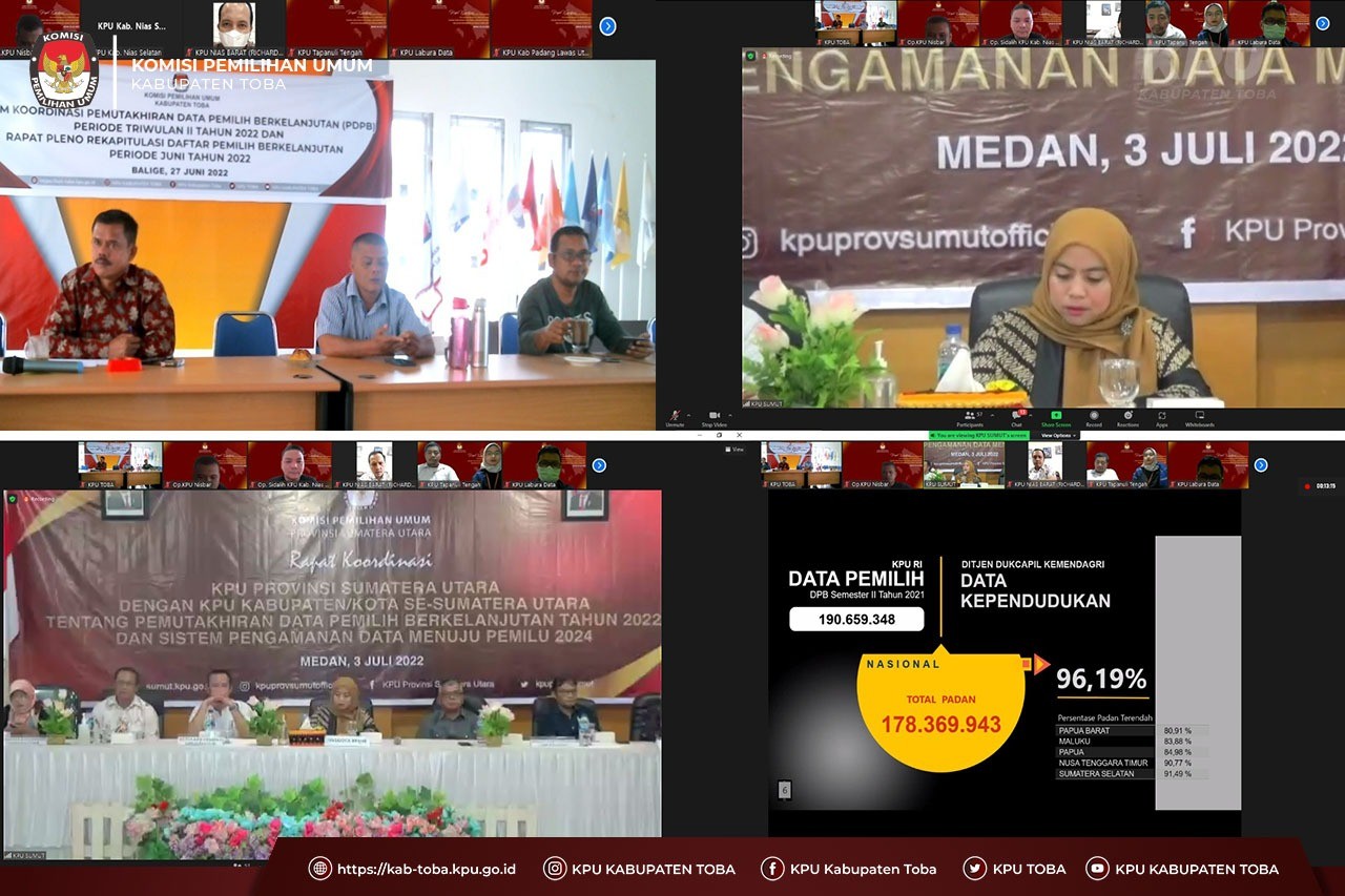 Sesuai amanat Peraturan KPU Nomor 6 Tahun 2021 tentang Pemutakhiran Data Pemilih Berkelanjutan, bahwa KPU Kabupaten/Kota menyelenggarakan forum koordinasi PDPB tingkat kabupaten/kota paling sedikit setiap 3 (tiga) bulan sekali. Pada hari ini Senin 27 Juni 2022 KPU Kabupaten Toba melaksanakan Forum Koordinasi Pemutakhiran Data Pemilih Berkelanjutan (PDPB) periode Triwulan II Tahun 2022 dan Rapat Pleno Rekapitulasi Daftar Pemilih Berkelanjutan periode Juni Tahun 2022. Kegiatan diikuti secara luring di Aula KPU Toba oleh Bupati Toba/mewakili, Bawaslu Toba Samosir, Polres Toba, Kodim 0210/TU, Badan Badan Kesbangpol-Pm Tobasa, Dinas Dukcatpil Toba, Dinas Kominfo Tobasa, Rutan Balige, dan Partai Politik Kabupaten Toba. Kegiatan juga diikuti oleh Camat dan Kepala Desa/Lurah se-Kabupaten Toba secara daring melalui aplikasi zoom. Rekapitulasi Daftar Pemilih Berkelanjutan periode Juni Tahun 2022 adalah sejumlah 140.298 pemilih, dengan rincian pemilih laki-laki sejumlah 68.453 pemilih dan pemilih perempuan sejumlah 71.845 pemilih yang tersebar di 16 kecamatan. Ada masukan dari Bawaslu Toba, yaitu tentang penggunaan Formulir Meninggal Dunia sebagaimana terlampir dalam Peraturan KPU No. 6 Tahun 2021, dan merekomendasikan 4 orang dari Kecamatan Ajibata yang berubah status dari warga sipil menjadi TNI. Masukan dari Rutan Balige agar para Kepala Desa/Lurah aktif melaporkan penduduk yang menjadi warga binaan di Rutan Balige sampai dengan tanggal 14 Februari 2024. Sedangkan masukan dari Dinas Kependudukan dan Pencatatan Sipil Kabupaten Toba antara lain agar Kepala Desa/Lurah aktif melaporkan penduduk yang sudah meninggal dunia ke Dinas Dukcatpil untuk diterbitkan akta kematiannya, serta jika ada warga yang bukan penduduk Toba agar mengajukan permohonan pindah domisili dari daerah asal ke Dinas Dukcatpil Kabupaten Toba.