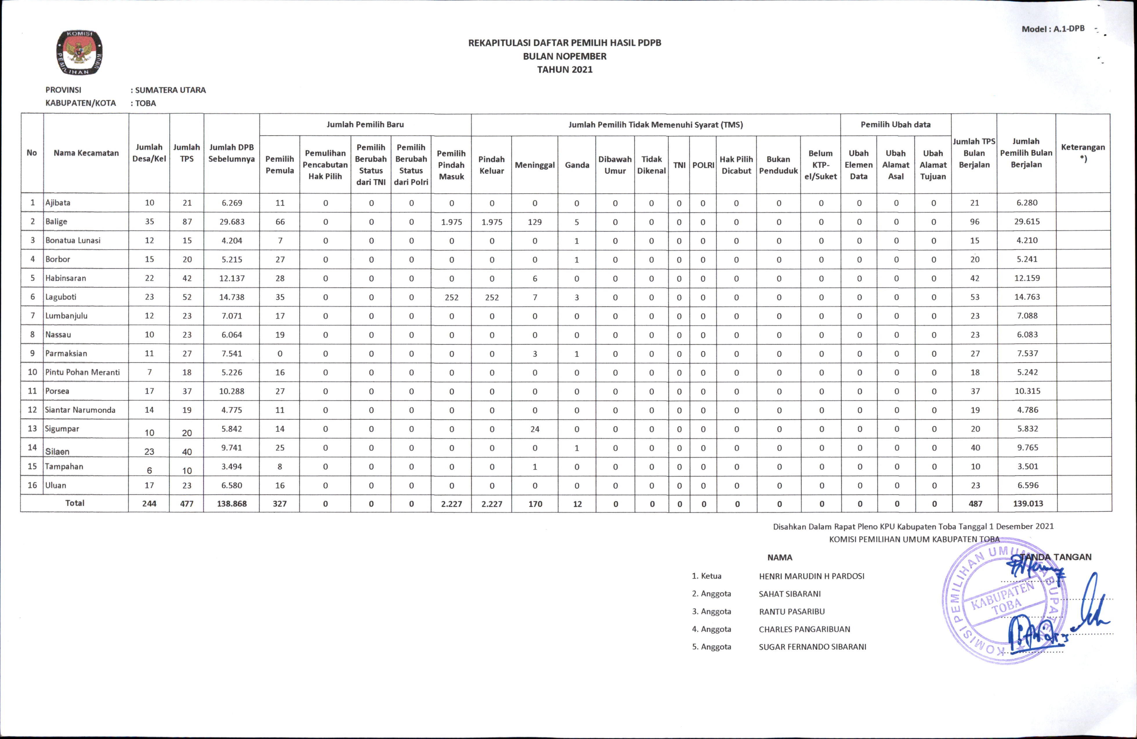 #TemanPemilih Daftar Pemilih Berkelanjutan Periode Bulan Desember Tahun 2021 Tingkat Kabupaten Toba adalah sebanyak 139.355 pemilih, terdiri dari pemilih laki-laki sebanyak 67.991 dan pemilih perempuan sebanyak 71.364. Adapun rinciannya adalah sebagai berikut : - Jumlah DPB bulan Nopember Tahun 2021 sebanyak 139.013 pemilih; - Jumlah pemilih baru bulan Desember Tahun 2021 sebanyak 355; - Jumlah pemilih tidak memenuhi syarat sebanyak 13 pemilih; yang tersebar di 16 (enam belas) kecamatan sesuai dengan rincian terlampir dalam berita acara pada link berikut : https://drive.google.com/file/d/1qnW9yrDXzRJ7XYkmUhez9-xzBA_61tux/view?usp=sharing Kegiatan ini dilaksanakan KPU Toba dalam Forum Koordinasi Pemutakhiran Data Pemilih Berkelanjutan Tingkat Kabupaten Toba pada hari Senin tanggal 27 Desember 2021 di Aula KPU Toba yang dihadiri oleh Partai Politik Tingkat Kab. Toba, Bawaslu Toba, Polres Toba, Dandim 0210/TU, Dinas Kependudukan dan Pencatatan Sipil, Rutan Balige, Dinas Kominfo, Badan Kesbangpol Kab. Toba secara luring. Sedangkan Camat dan Kepala Desa/Lurah mengikuti secara daring melalui aplikasi zoom. Dalam forum koordinasi, catatan penting yang dihasilkan antara lain : 1. Masyarakat diharapkan agar proaktif untuk mengurus akte kematian keluarga yang sudah meninggal dunia; 2. Kepala Desa/Lurah diharapkan dapat memfasilitasi pengurusan akte kematian warganya; 3. Pengurusan akte kematian sudah dipermudah, cukup dengan membawa surat keterangan kematian dari kepala desa/lurah ke Dinas Kependudukan dan Pencatatan Sipil Kabupaten Toba. #KPUMelayani
