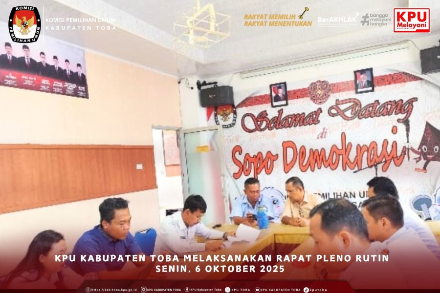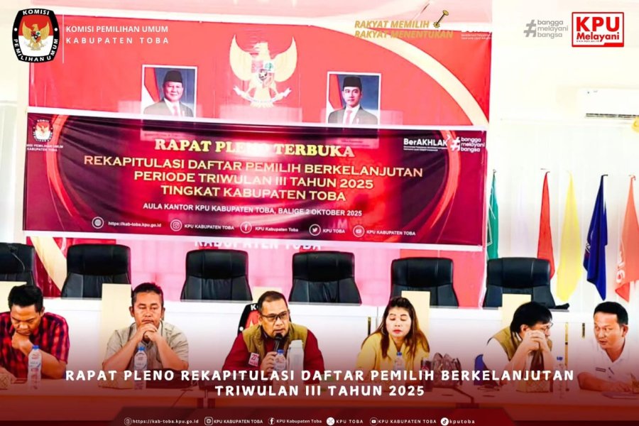 KPU Kabupaten Toba menggelar Rapat Pleno Rekapitulasi Daftar Pemilih Berkelanjutan Triwulan III Tahun 2025 di Aula Lt.2 kantor KPU Kabupaten Toba. Rapat dibuka langsung oleh Ketua KPU Kabupaten Toba Sugar Fernando Sibarani, menyampaikan bahwa tujuan kegiatan ini adalah menetapkan rekapitulasi data pemilih dengan penuh ketelitian, karena hasil yang ditetapkan akan menjadi dasar untuk Triwulan IV.