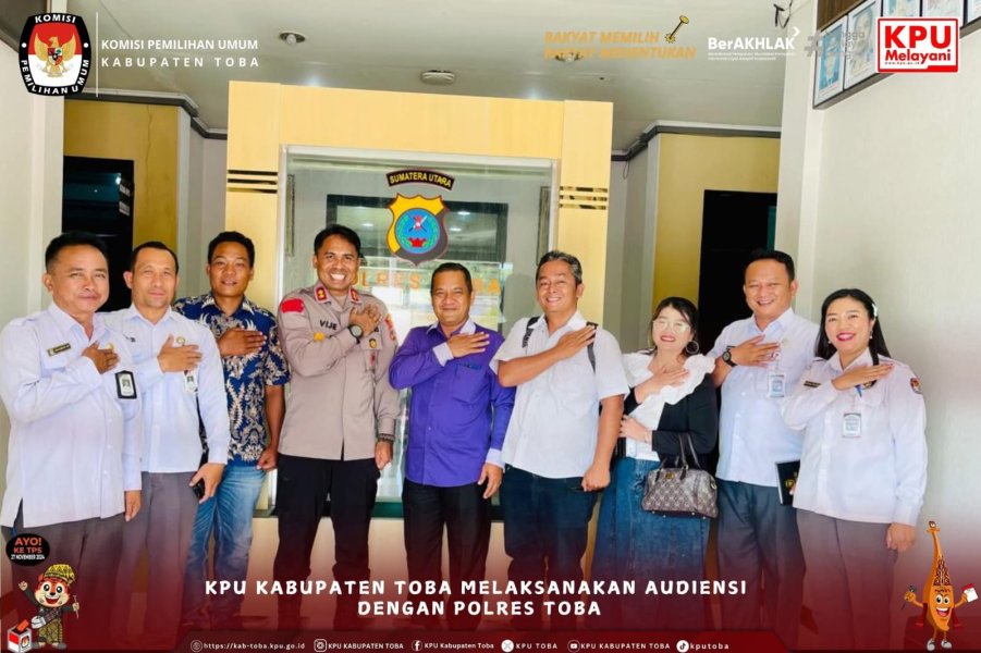 #TemanPemilih, Audiensi KPU Toba dengan Polres Toba, Siantar Narumonda, Senin (26/5/2025). KPU Kabupaten Toba melaksanakan audiensi ke Polres Toba, dalam audiensi ini Sugar Sibarani selalu Ketua KPU Kabupaten Toba menyampaikan bahwa tujuan audiensi untuk saling kenal dan senantiasa menjaga hubungan baik dengan semua pemangku kepentingan (stakeholder) menjadi alasan utama KPU Kabupaten Toba mendatangi Polres Toba. Kedatangan KPU Toba ini disambut baik oleh AKBP Vinsensius Jimmy Parapaga, S.I.K sebagai Kapolres Toba yang baru diruang kerjanya. Vinsensius menyampaikan terimakasih atas kunjungannya dan mengharapkan agar hubungan baik tetap terjalin baik sebagaimana dengan Kapolres sebelumnya serta menyampaikan akan melaksanakan kunjungan balasan sebagai bahagian untuk memperkuat hubungan baik tersebut. Hadir dalam audiensi tersebut anggota KPU Kabupaten Toba Helderia Purba, Posman Naiborhu, Erikson Sitorus, dan Sekretaris KPU Kabupaten Toba Richardo F. Butarbutar, Kasubbag membidangi Parhubmas dan SDM Frans L. Sitinjak, Kasubbag Teknis Mindo Simbolon, beserta staf/operator Siparmas. #KPUMelayani